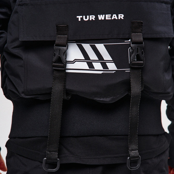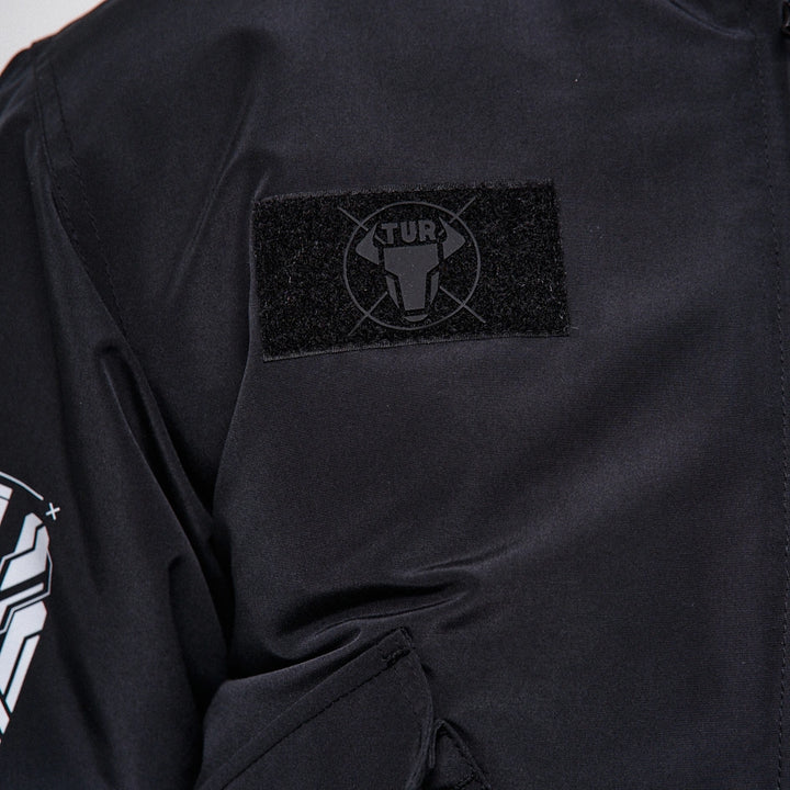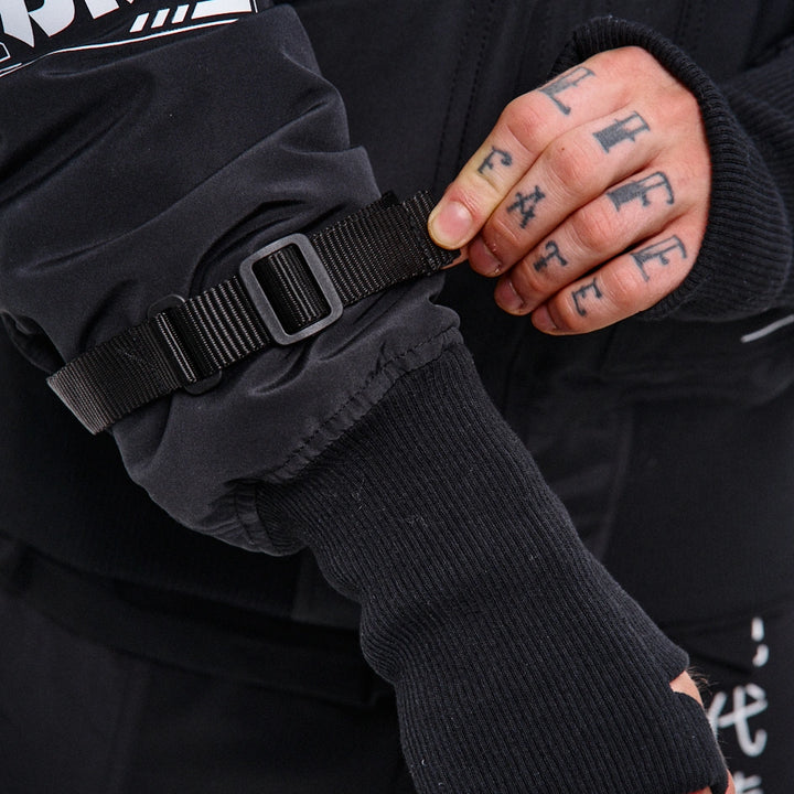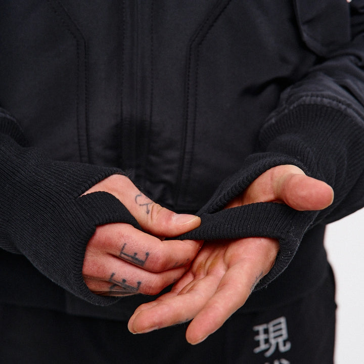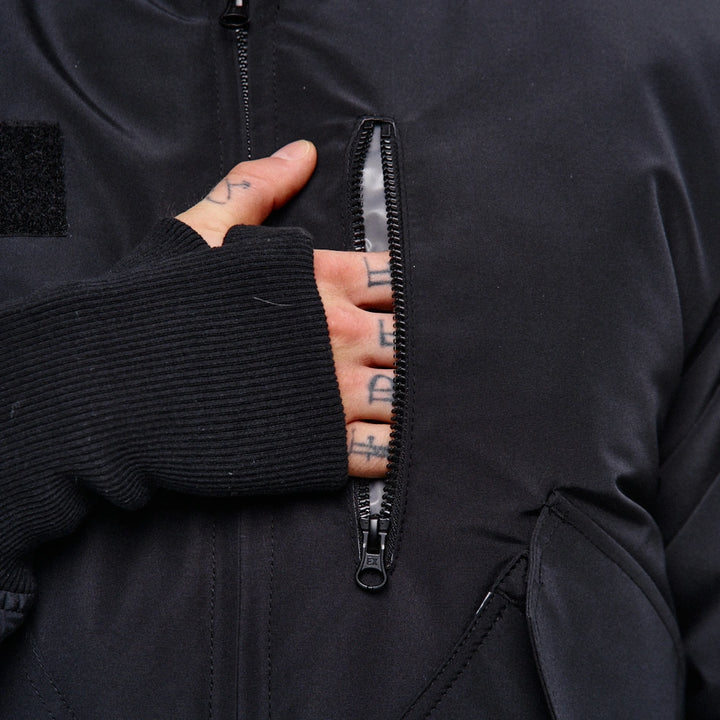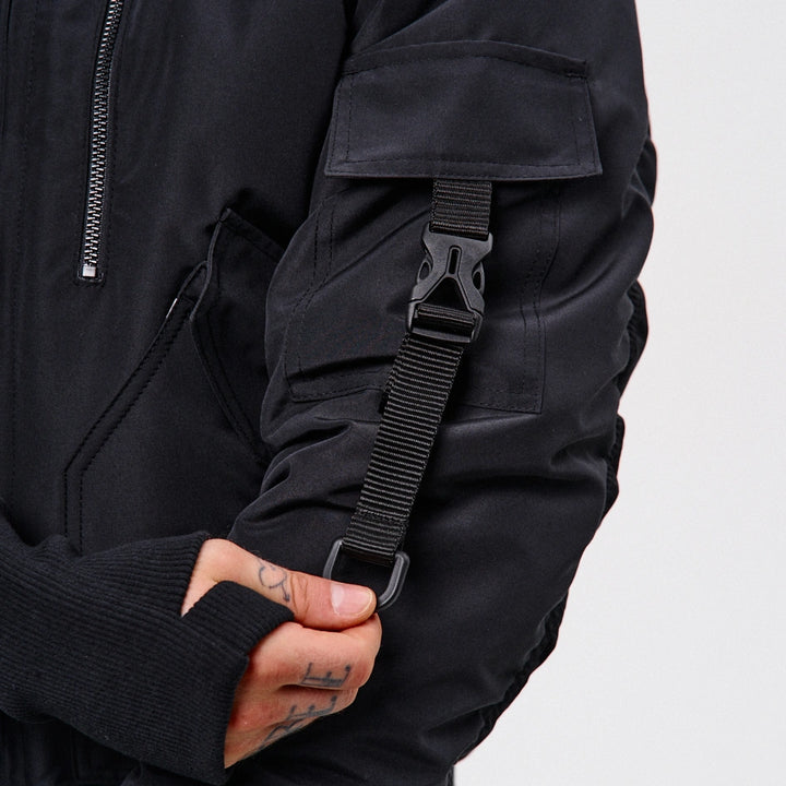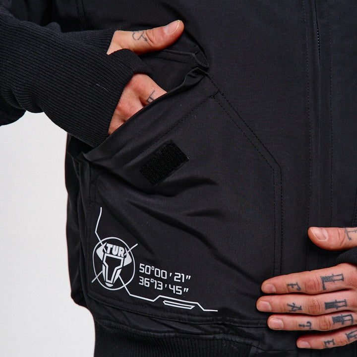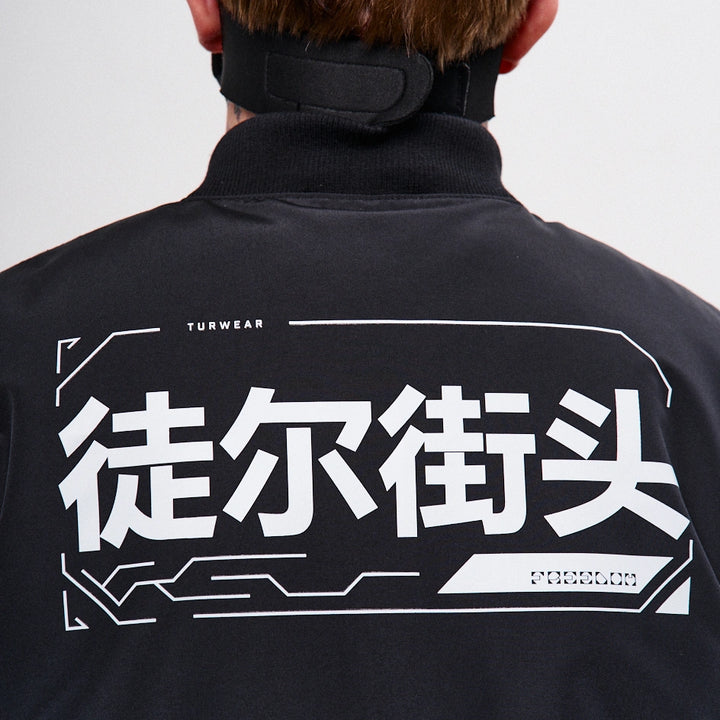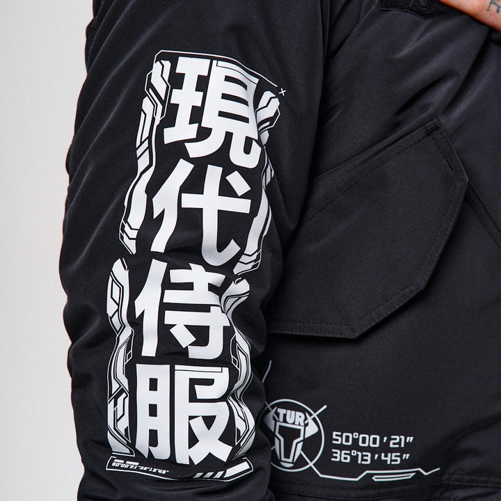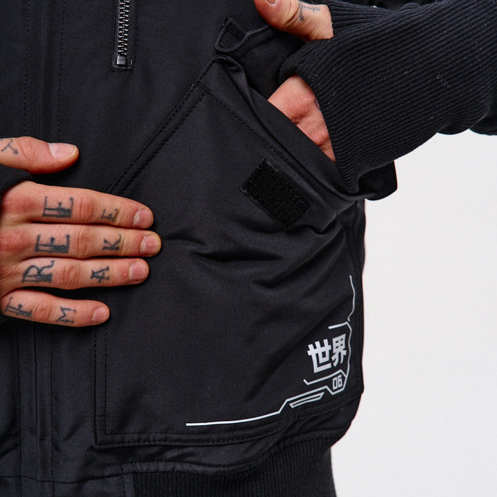 A cyberpunk-style bomber jacket designed based on the classic Alpha Industries fit. On the left chest — a zip pocket, on the left sleeve — a flap pocket with a buckle. Two patch pockets with flaps, just like the iconic Alpha bomber. The jacket features 6 grey prints across the entire garment.