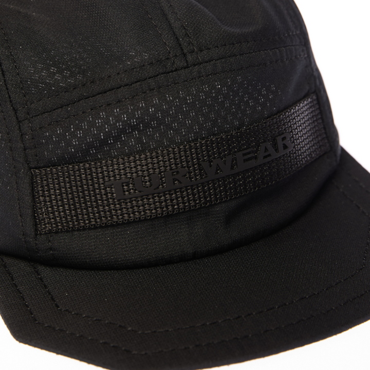 A cap made from lightweight, breathable raincoat fabric. It features a shortened visor. A strap with branded embroidery is stitched at the front. The size is universal and adjustable with an elastic band.
