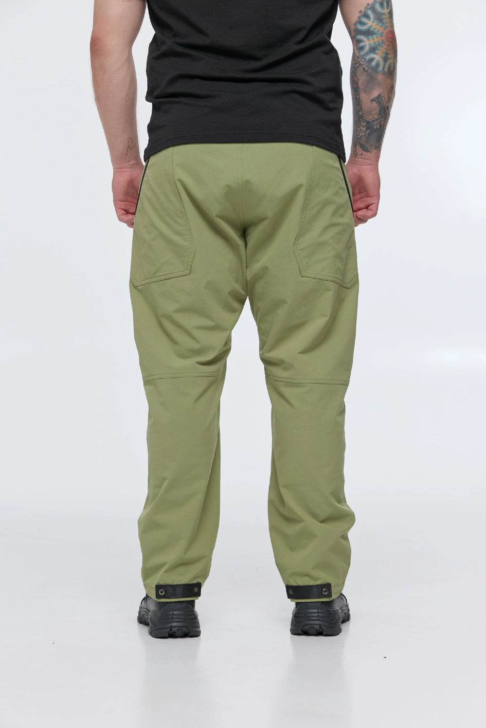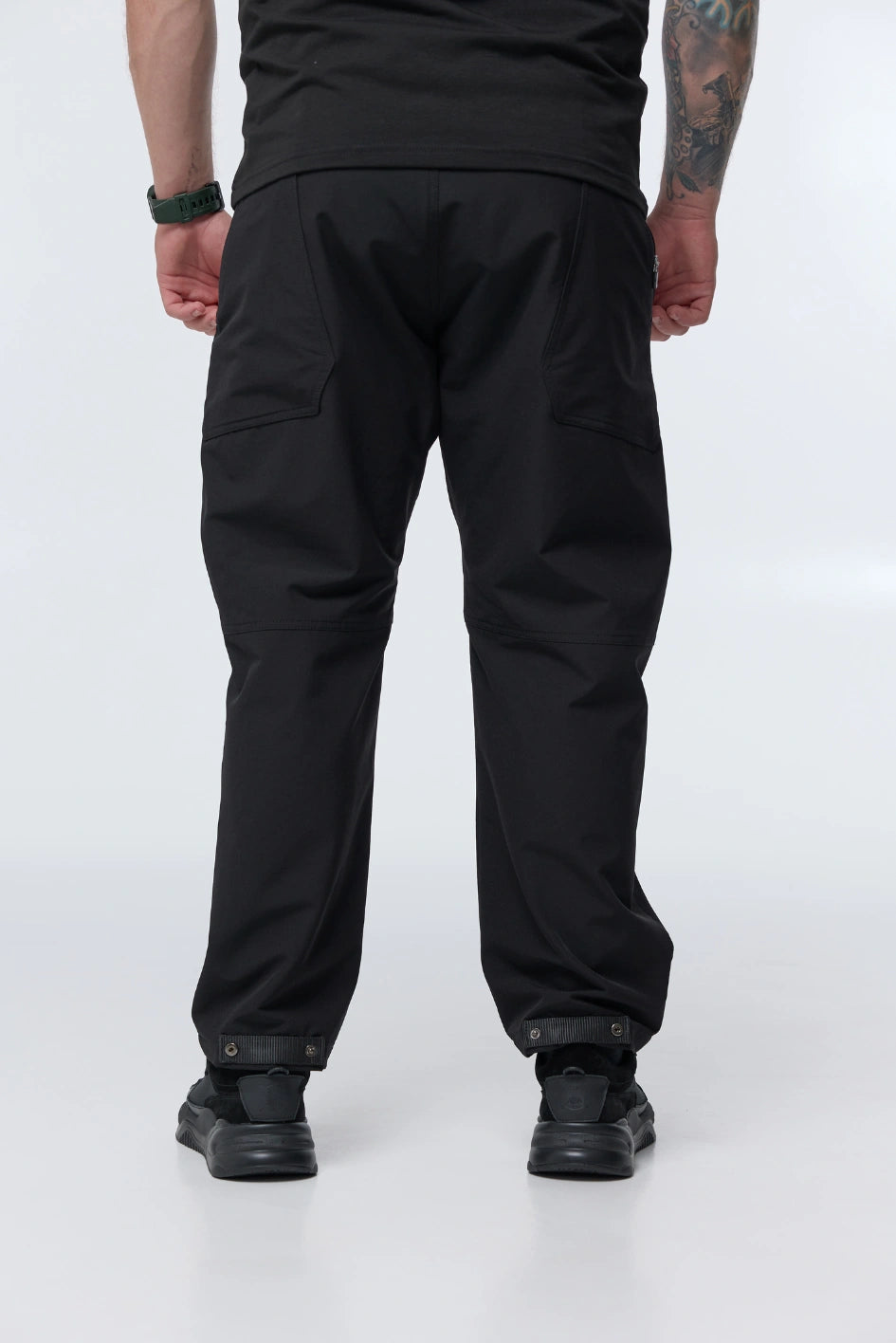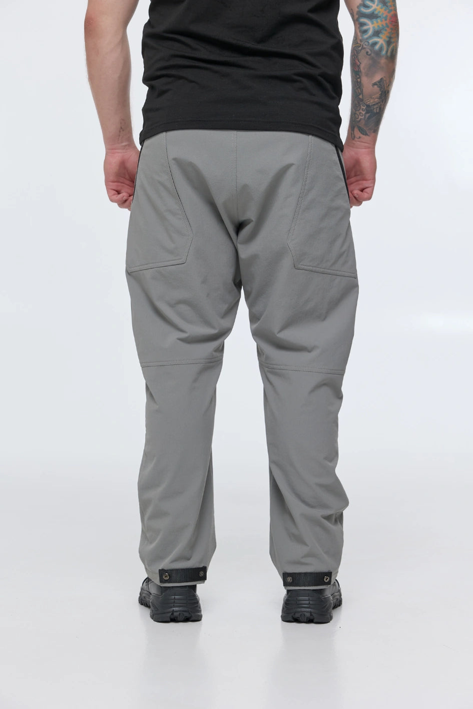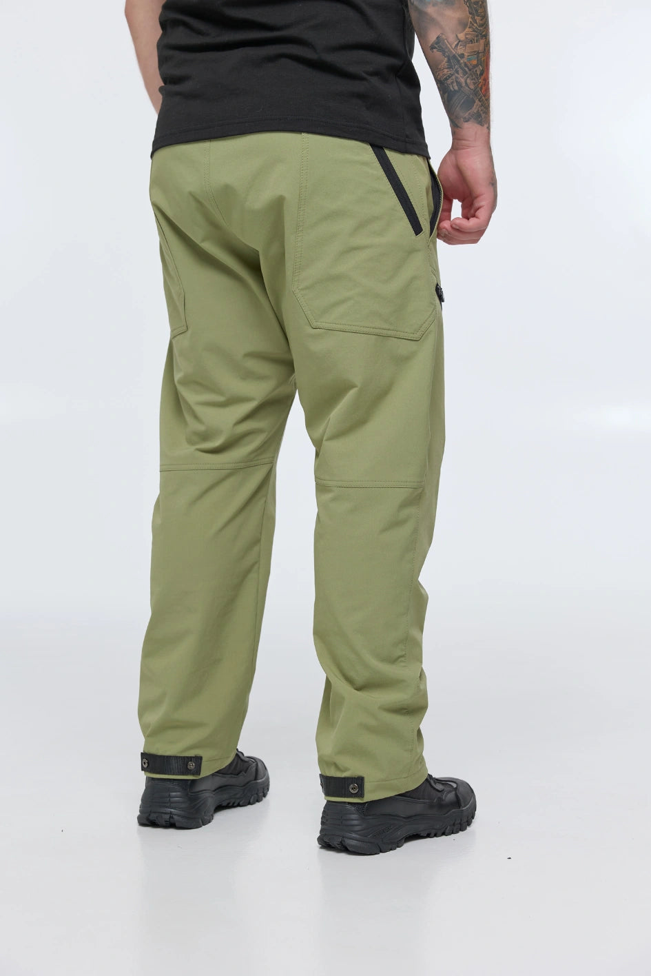 Loose-fit pants with a straight cut, belt loops, and an integrated elastic waistband. On the right side under the waistband — a half-ring for attaching carabiners, keychains, or pouches. The fly is equipped with a YKK zipper. The model features 7 pockets: two top pockets, two back zippered pockets, two front zippered pockets, and a separate phone pocket on the right side. The front is constructed with cuts and pleats in the knee area, and at the lower back part — a strap with buttons for adjusting the leg width. The model belongs to the Reborn collection and is the second generation of Apache pants, which were a bestseller of the brand between 2015–2020.