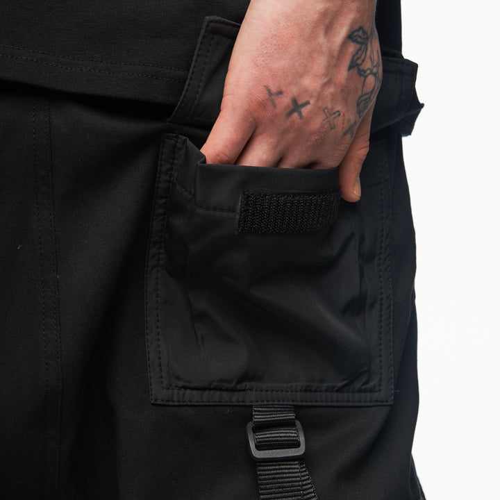 Functionality includes six pockets: two side flap cargo pockets with Velcro, two back pockets, and two standard side pockets.
