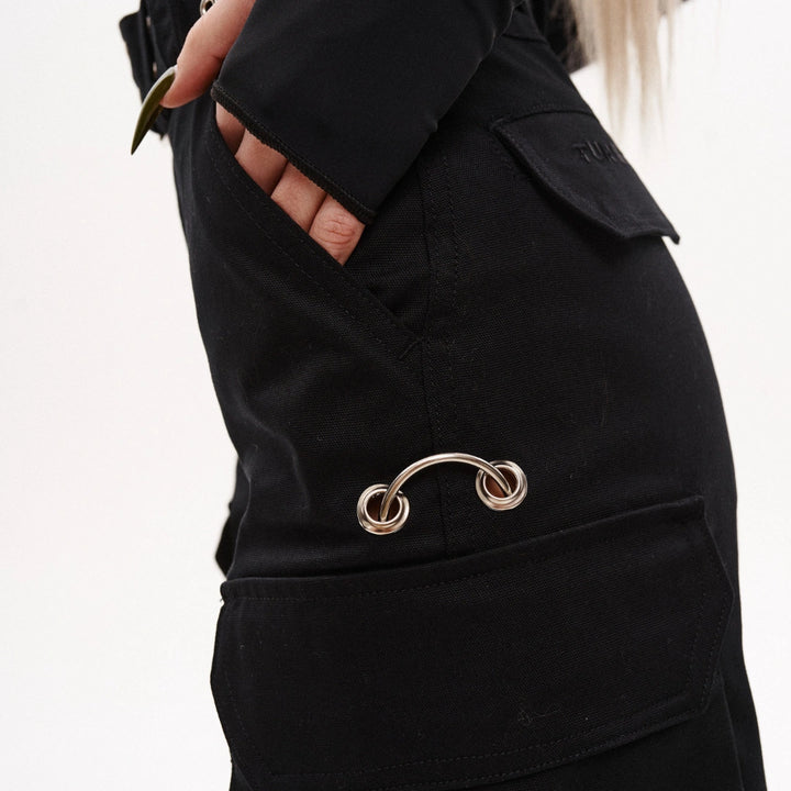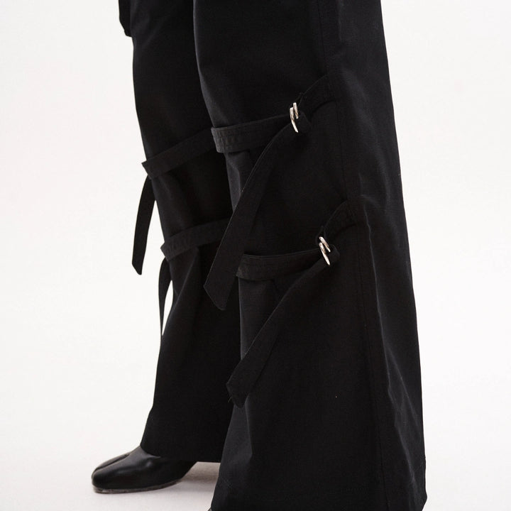 Low-rise wide cargo pants made from stretch canvas. Feature flap patch pockets on the sides, a detachable pocket with a carabiner, a back welt pocket, and a waistband with belt loops and metal eyelets.