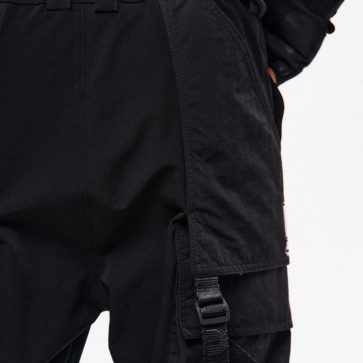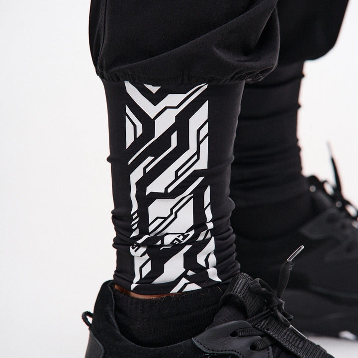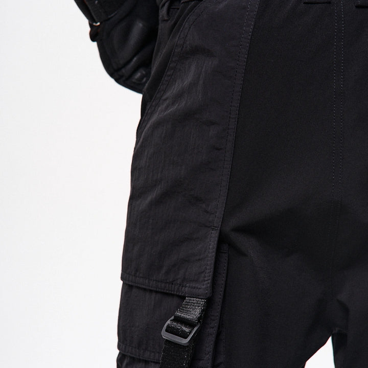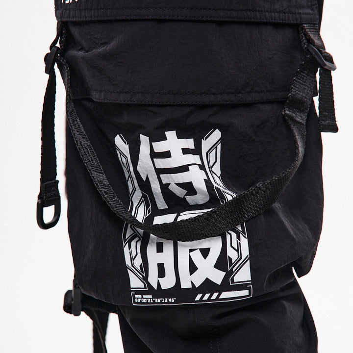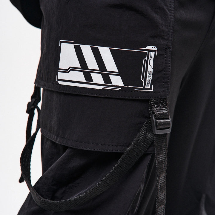 Loose cargo pants with high cuffs made of dense, elastic nylon. Print on the right cuff. Six patch pockets – the upper flap pockets overlap the side pockets, creating a layered effect. Decorative straps with buckles on the knees allow adjusting the width of the legs. Straps connecting the corners of the upper pockets are finished with D-rings – for attaching pouches or keychains. Another D-ring is integrated into the front belt loop. The pants feature belt loops and an internal elastic band for a comfortable fit. Closure – button fly. Four cyberpunk-style prints emphasize the model’s character. Side pockets are constructed based on the “Cyber” cargo pants pattern.