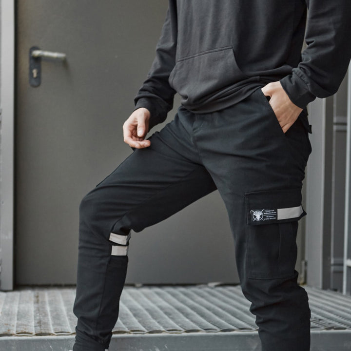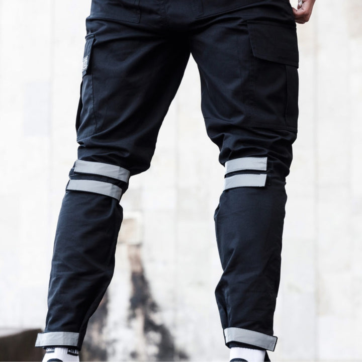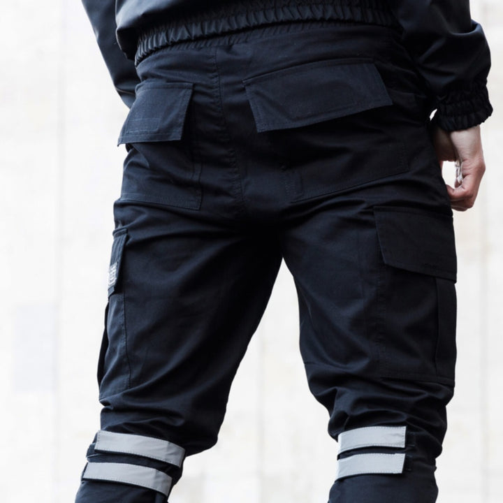 Tapered, straight-cut cargo pants — a versatile choice for daily movement. The elastic waistband with a drawstring ensures a comfortable fit. The leg width can be adjusted at the knees and cuffs using Velcro straps with reflective details — combining utility with style.