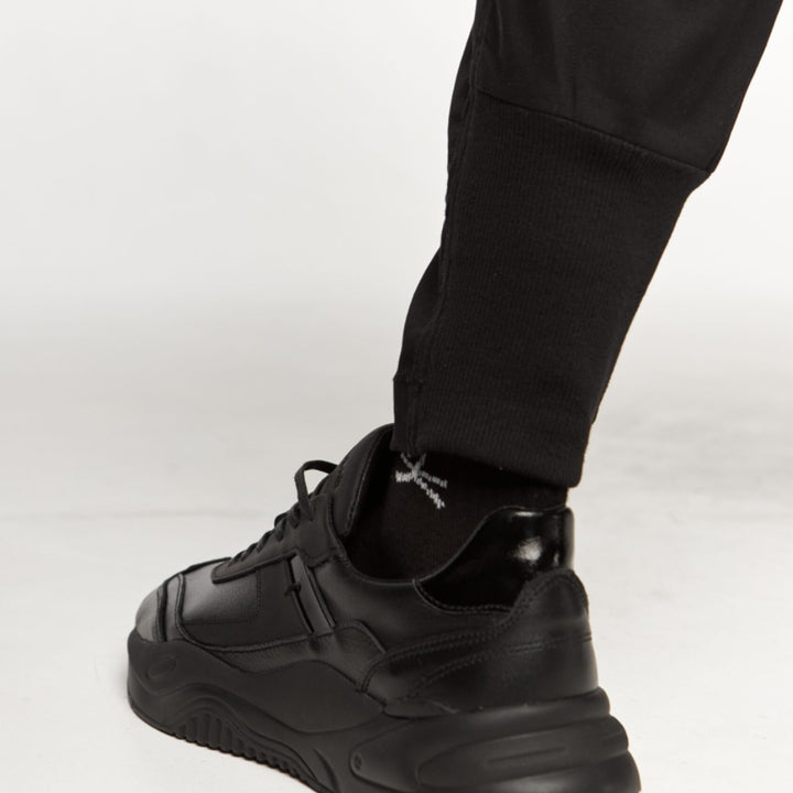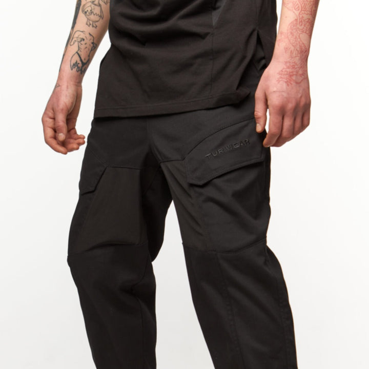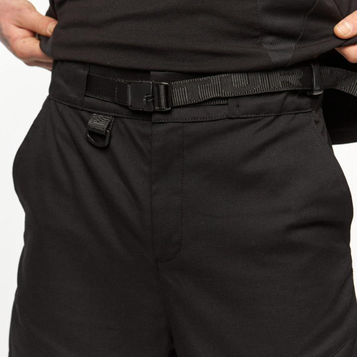 The model features six pockets: two inner side pockets, two large patch pockets with flaps, and two rear pockets with concealed openings under the placket. The legs taper at the bottom, and a ribbed insert at the back ensures comfort even during active movement. Style, technicality, and comfort combined in one garment.