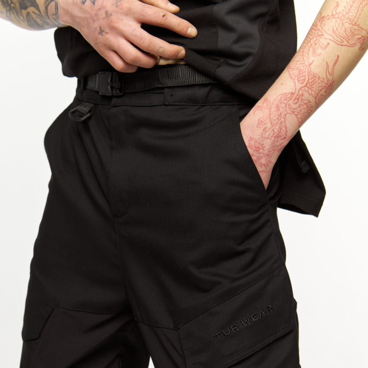 Loose-fitting pants with a low waist — a balance of freedom of movement and precise detailing. The waistband is elastic with an integrated webbing belt and magnetic fastener for quick fastening. Front construction seams enhance the fit and add volume.