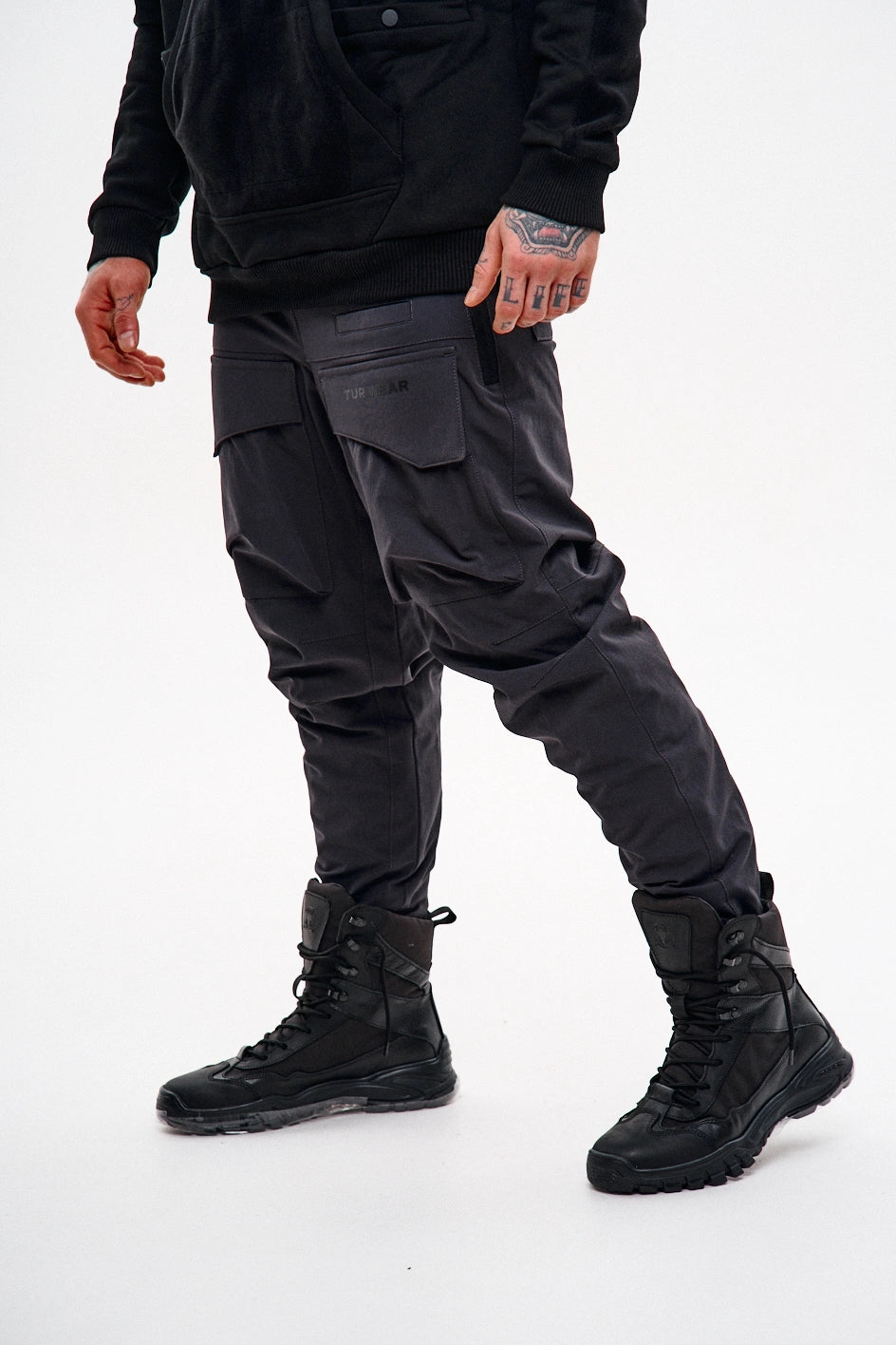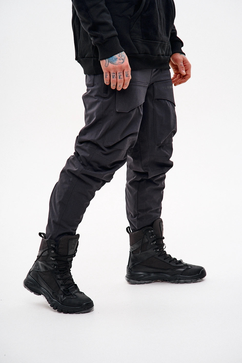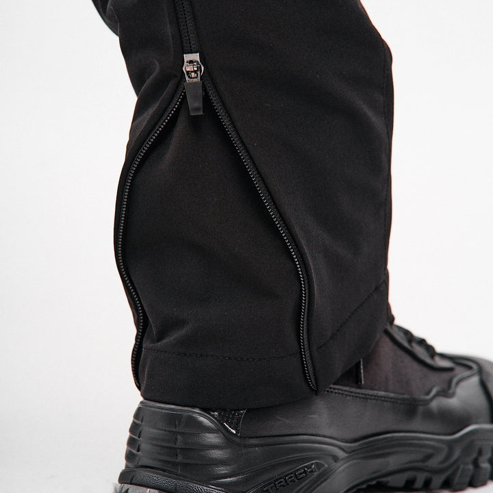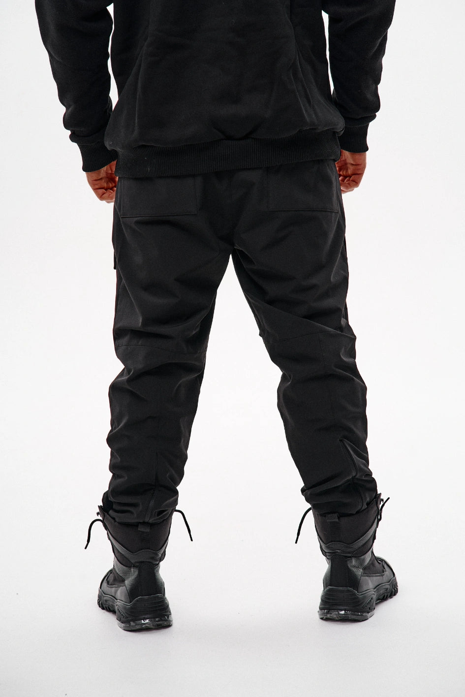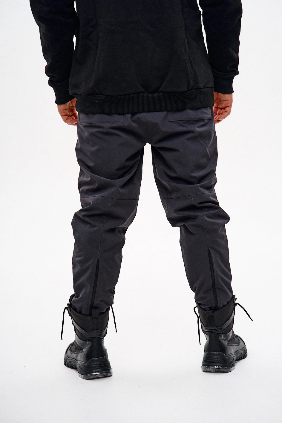Pants with a relaxed fit and straight leg line. The zippers at the back of the legs allow you to narrow them — adapting to any type of footwear. Waistband with belt loops and an integrated elastic band. On the left side under the waistband, there is a half-ring for attaching a keychain, carabiner, or gear. Fly fastened with a YKK zipper.