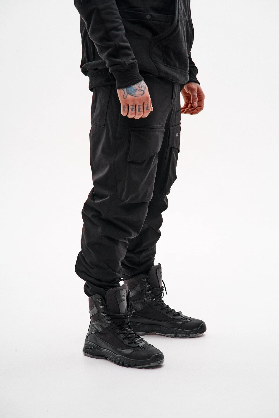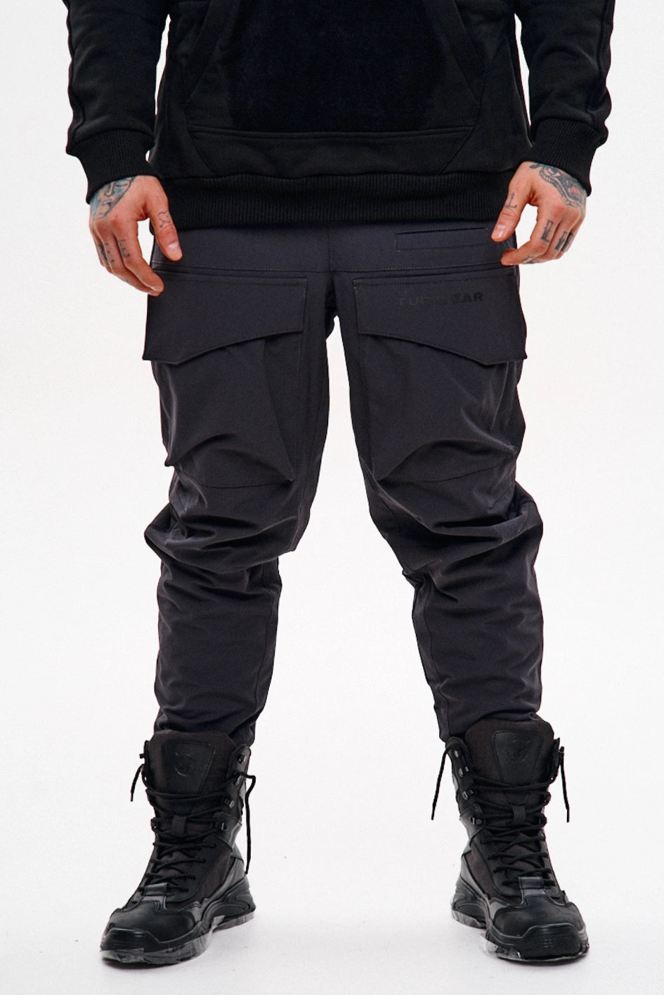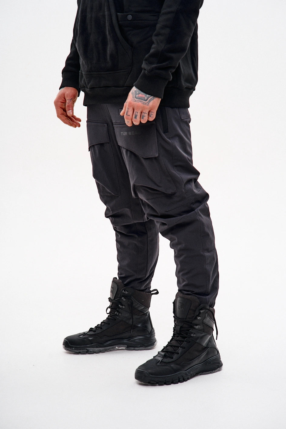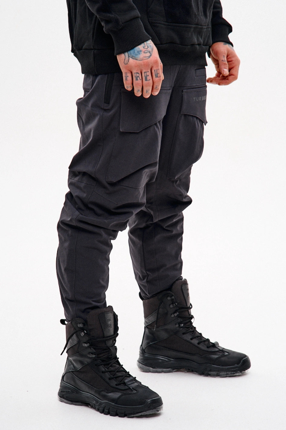Pants with a relaxed fit and straight leg line. The zippers at the back of the legs allow you to narrow them — adapting to any type of footwear. Waistband with belt loops and an integrated elastic band. On the left side under the waistband, there is a half-ring for attaching a keychain, carabiner, or gear. Fly fastened with a YKK zipper.