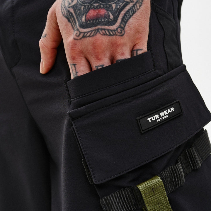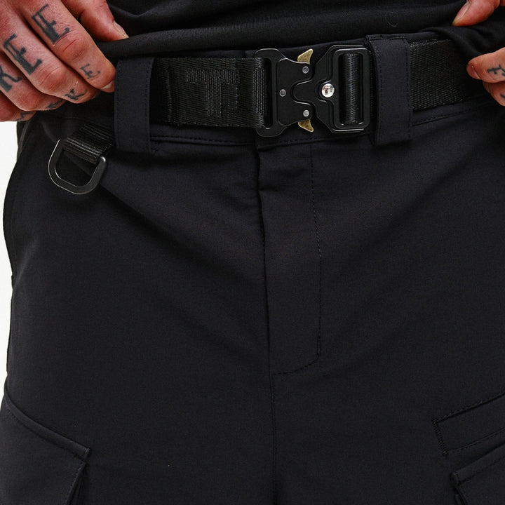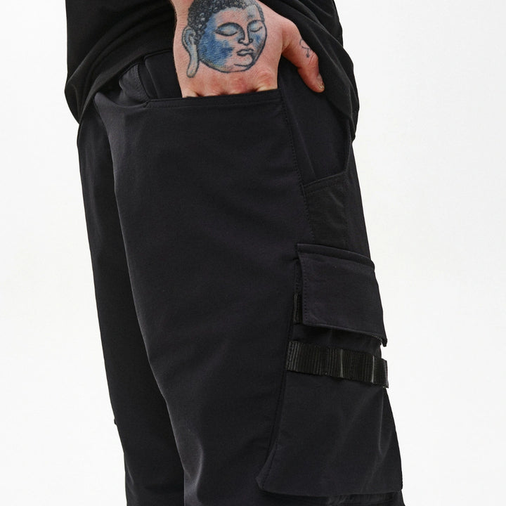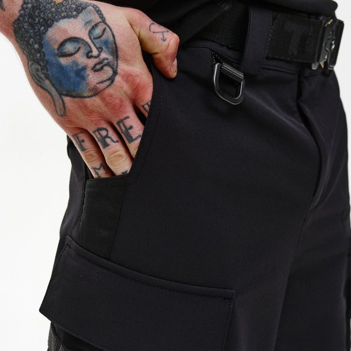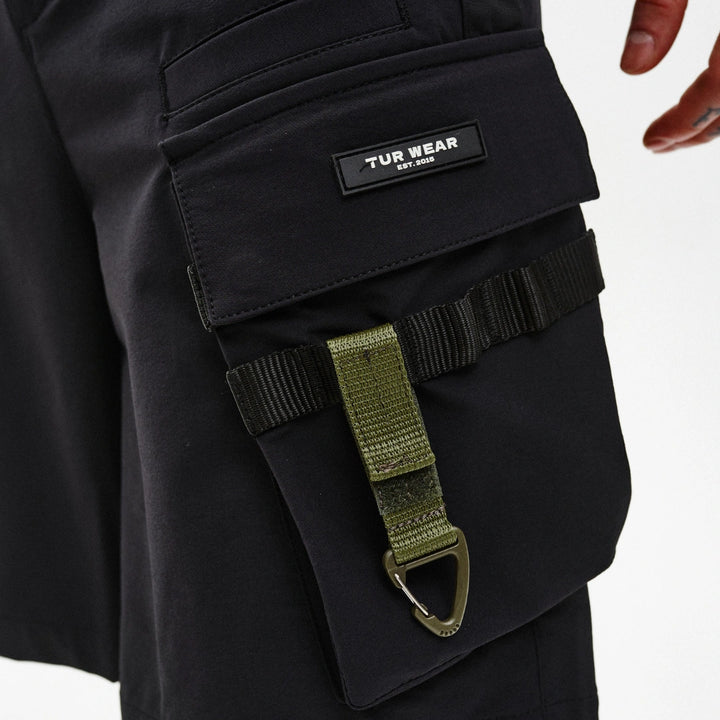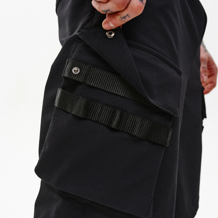 Cargo shorts with reinforced functionality and ergonomic design. Feature 7 pockets: two front, two back, two flap side pockets, and one welt pocket on the front left. Flap pockets close with snap buttons placed on webbing straps for durability and easy access.