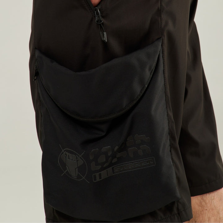 Oversized cargo shorts with a low-rise fit. The waistband includes an integrated elastic band with adjustable webbing and a fastener secured with side-release buckles. The webbing exit is reinforced with vertical stitching to prevent the buckle from slipping under the fabric. A semi-ring loop is sewn onto the right side of the waistband for convenience. The side pockets are spacious, with zippered openings at the fold. A signature black print is placed on the left pocket. Behind each main pocket is an additional zippered opening on the rear panel, providing dual access to each patch pocket for added functionality.