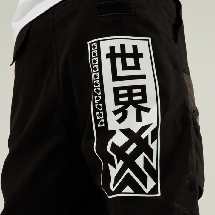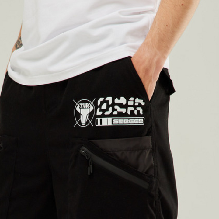 Low-rise, loose-fit cargo shorts. The waistband includes an integrated elastic band for a better fit, along with a dual-sided adjustable webbing belt for precise fastening. Plastic belt holders are sewn into the side seams to secure the loose end of the webbing. Two classic-style pockets are placed at the top. The patch pockets feature a triple-entry design: the first access is via a rubberized zipper; the second is a top-entry pocket made of rainproof fabric; and the third is a hidden compartment between the rainproof insert and the main cotton patch pocket. All zipper pullers are black and double-layered. The model is finished with two white prints for an additional visual accent.