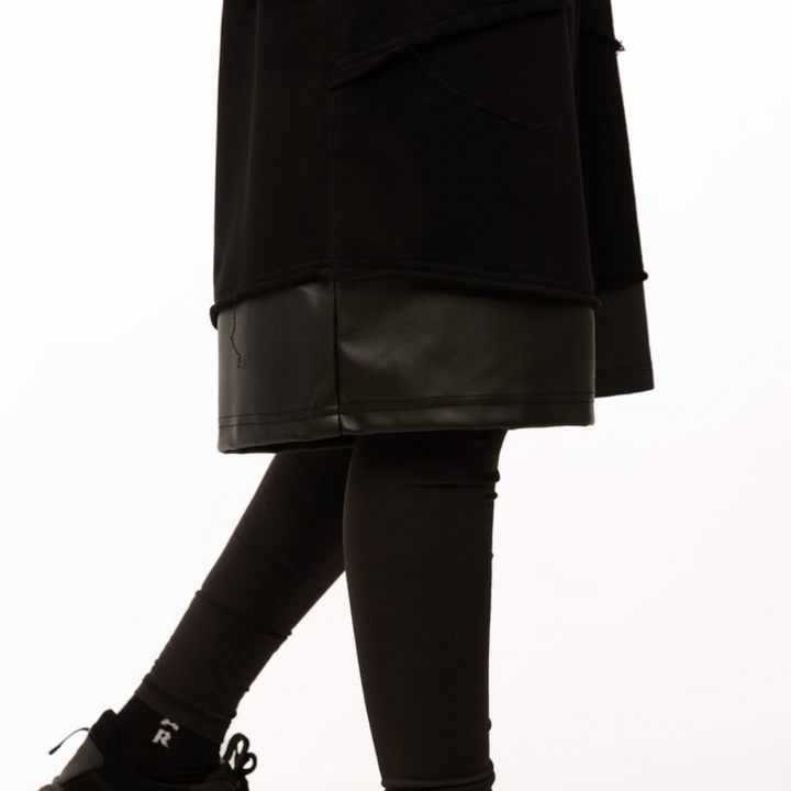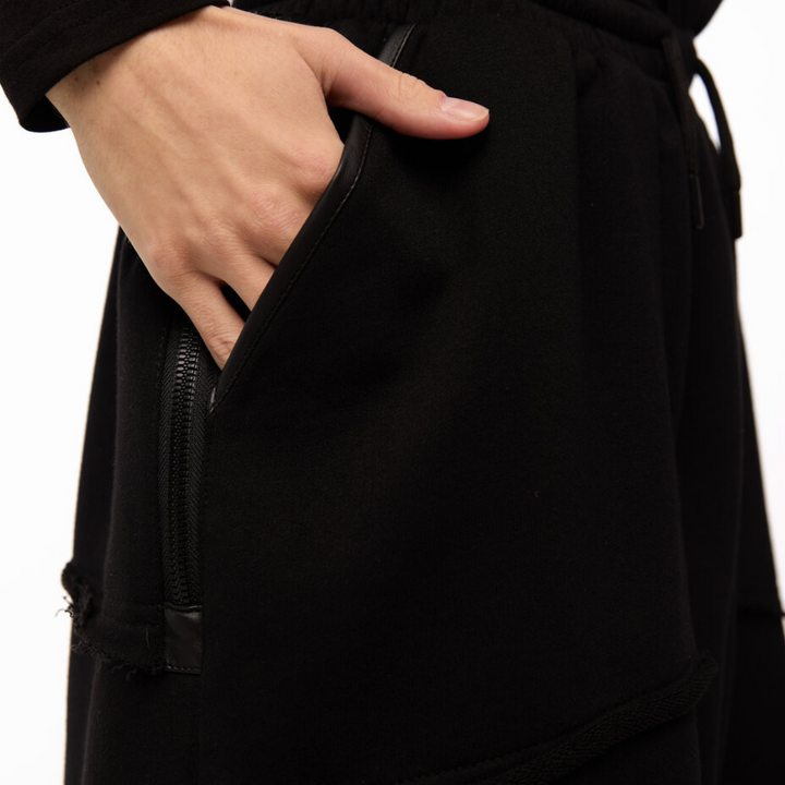 Made from dense three-thread knit with a blended composition for durability and comfort. Faux leather inserts add a bold visual accent while reinforcing high-stress areas. The fabric itself is non-stretch.