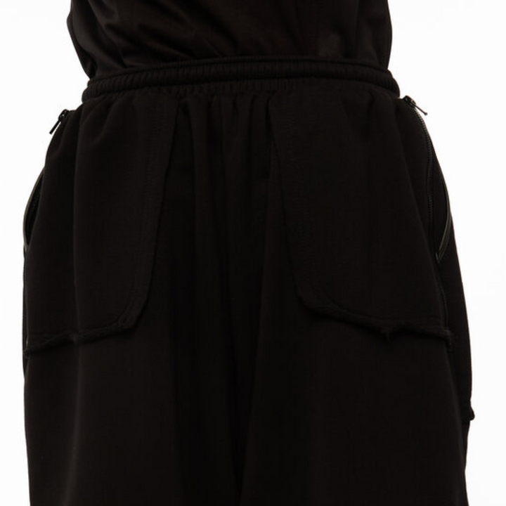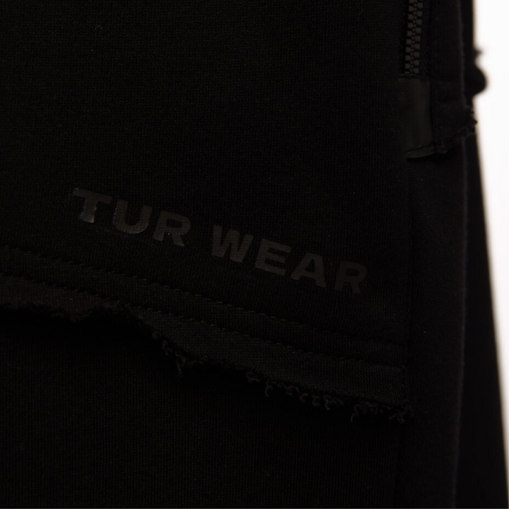 Relaxed-fit shorts crafted from heavyweight knit. Faux leather panels at the hem enhance the aesthetic and durability. The front features two deep patch pockets trimmed with leather-look edging, and a zippered back pocket on the right side provides secure storage for small items. Raw-cut edges at the hem and pocket seams deliver a rugged, styled finish. The elastic waistband includes a drawstring for adjustable fit. A black “TUR WEAR” print on the left pocket adds a distinctive signature element.