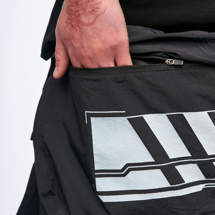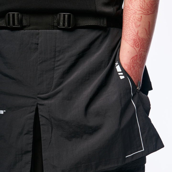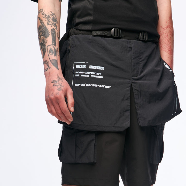 Light stretch fabric for a comfortable feel and loose fit. The model features front and back patch pockets with zippers and a large pocket bag for convenient storage. The samurai armor-inspired look is achieved through the attached patch pockets. The upper patch pockets are made from lightweight, stretchy fabric, ensuring comfort in summer. The pockets with prints add a stylish touch. A dual-regulation waistband with elastic allows for an adjustable fit to the body.