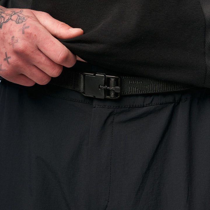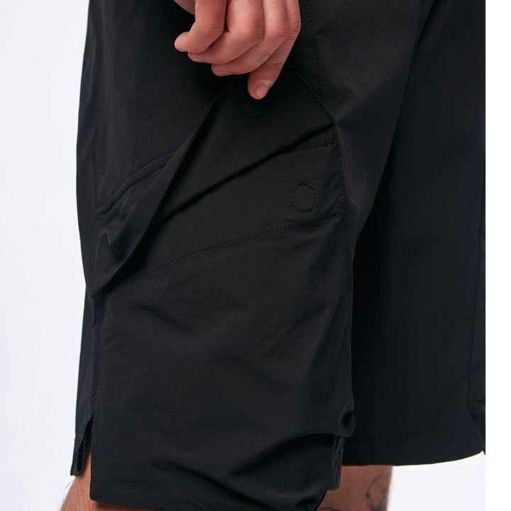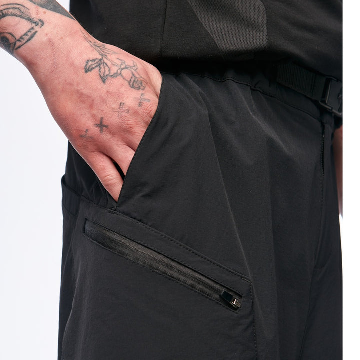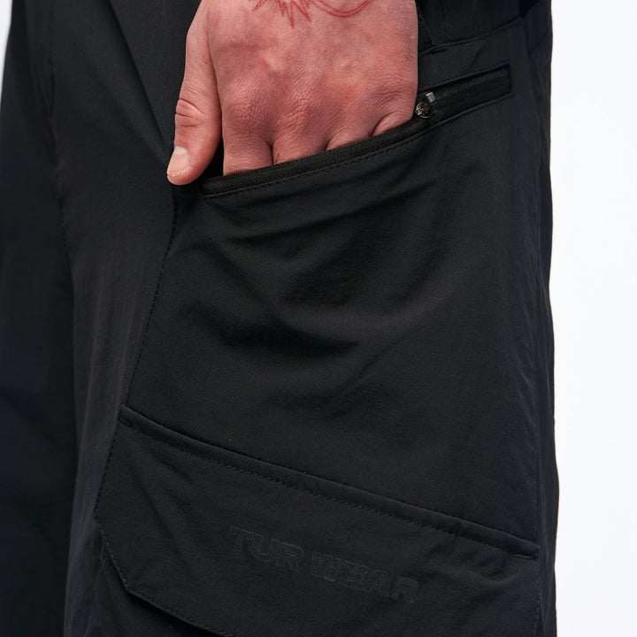 Relaxed-fit shorts tailored for an active lifestyle. The elastic waistband includes a belt strap with a magnetic buckle for easy width adjustment. The design includes six pockets: two side pockets, four flap pockets (two with zippers, two with magnetic closures), and two rear pockets. A signature black Tur Wear print on the left pocket adds a bold style element.