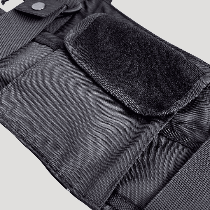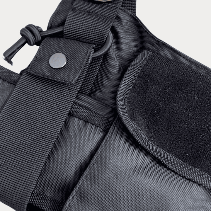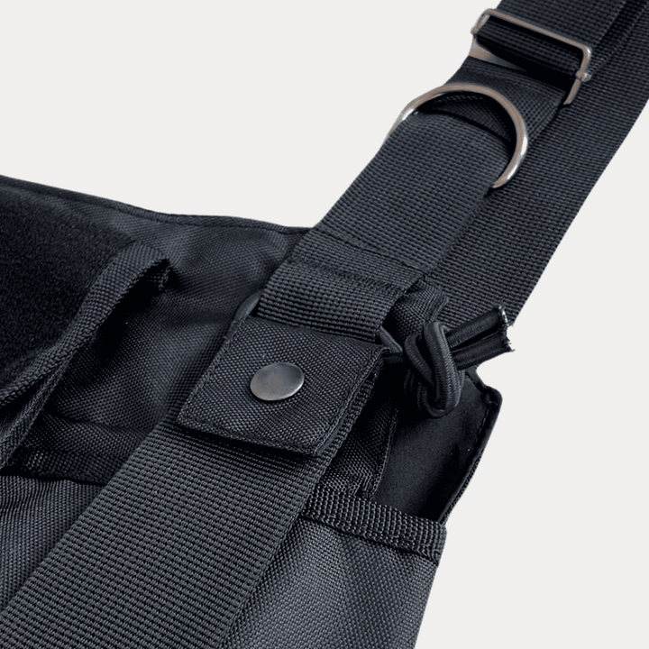 A chest bag with three front pockets. The length of the straps is adjustable. There are auxiliary rings for carrying various items.