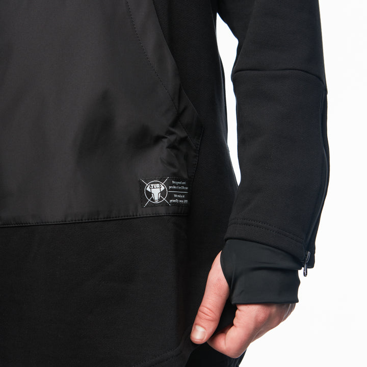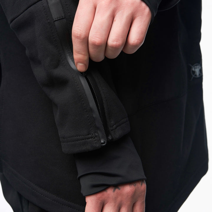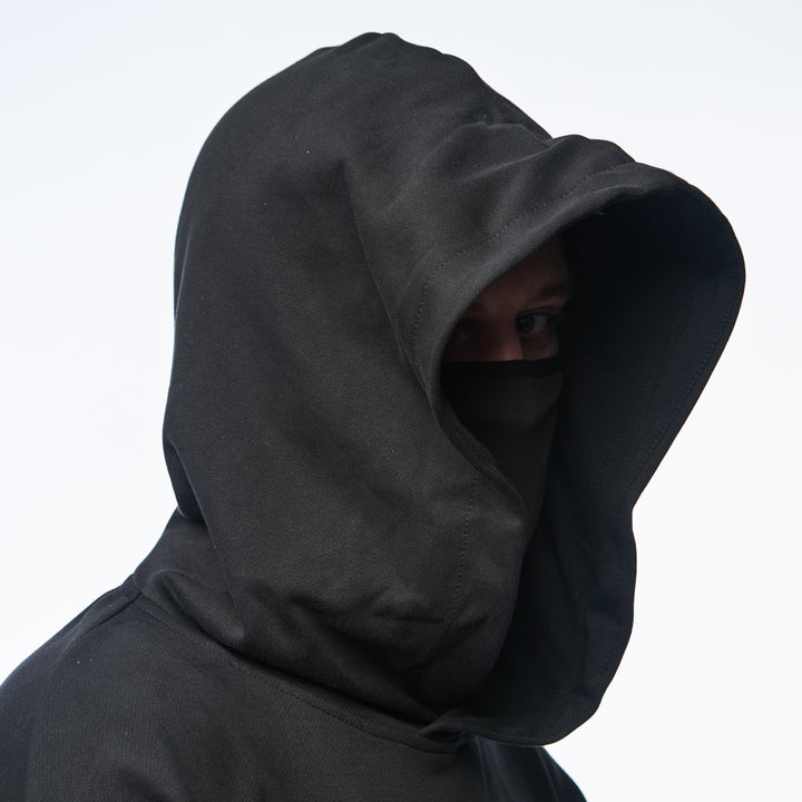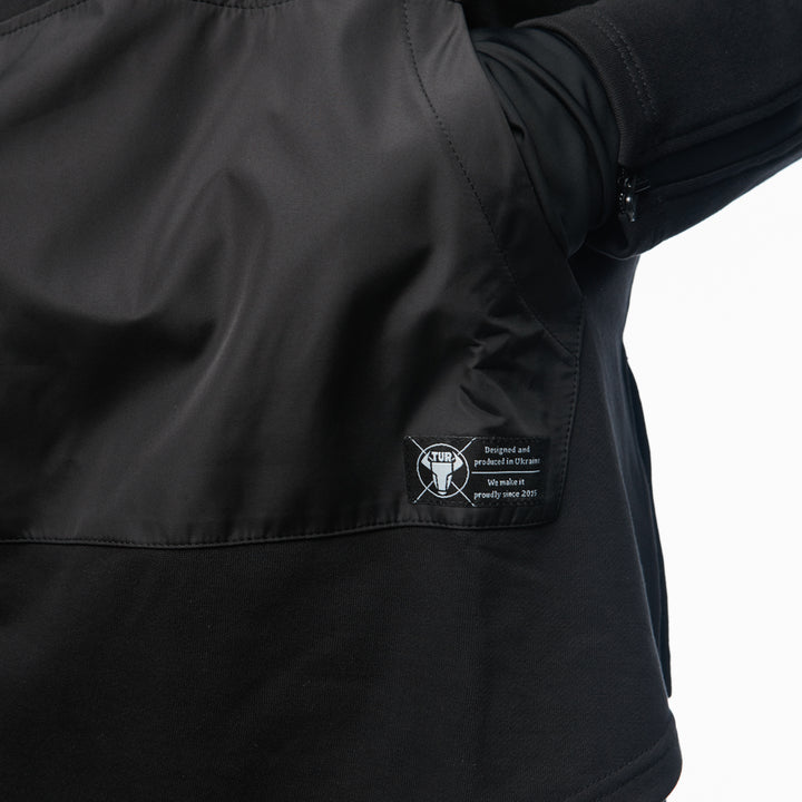 An oversized hoodie designed for urban warriors. The deep double hood acts like a helmet, protecting you from the noise of the outside world. Tech fabric inserts, side slits for easy access to the patch pocket, and the anatomical inner sleeve with a "glove-like" effect — every detail is made for comfort and mobility. Zippers on the sleeves add versatility and style. This hoodie is your shell in a constantly changing world.