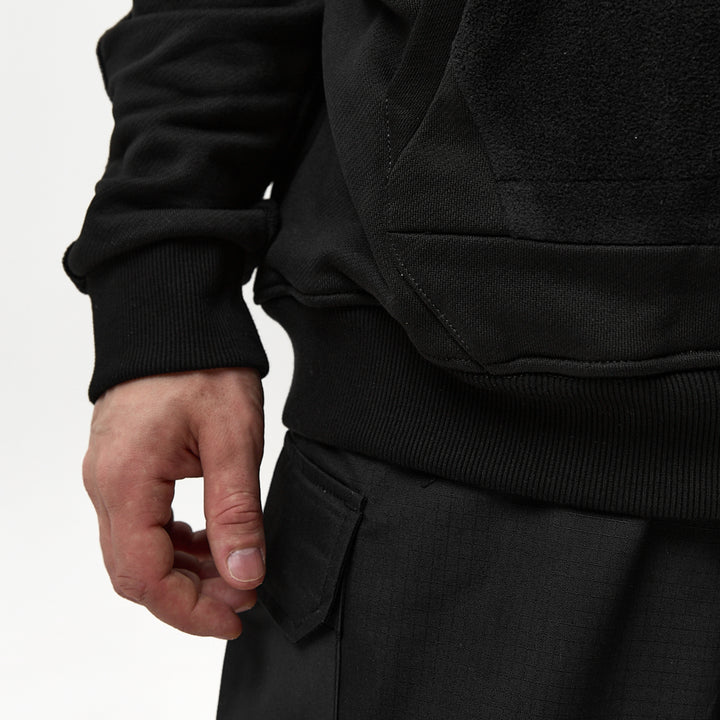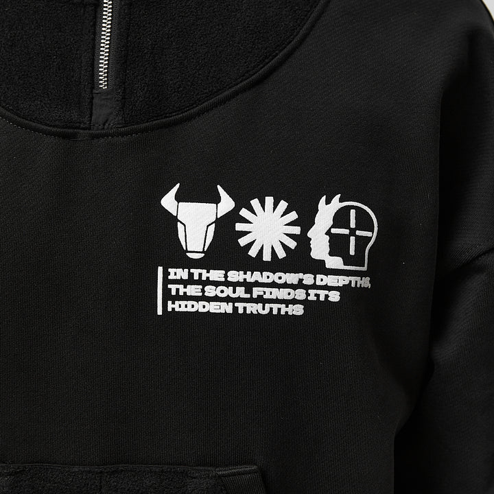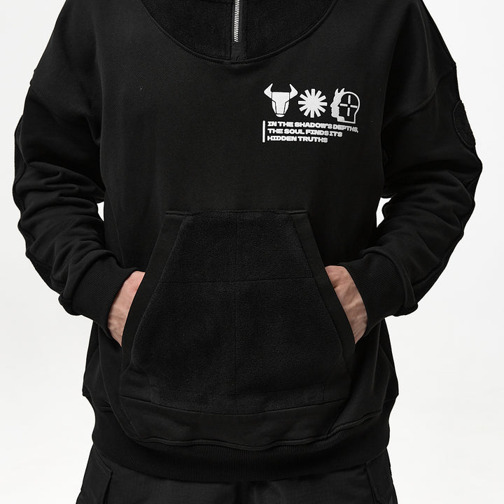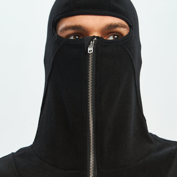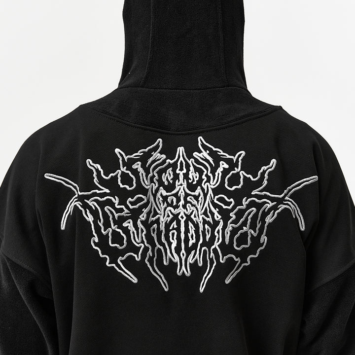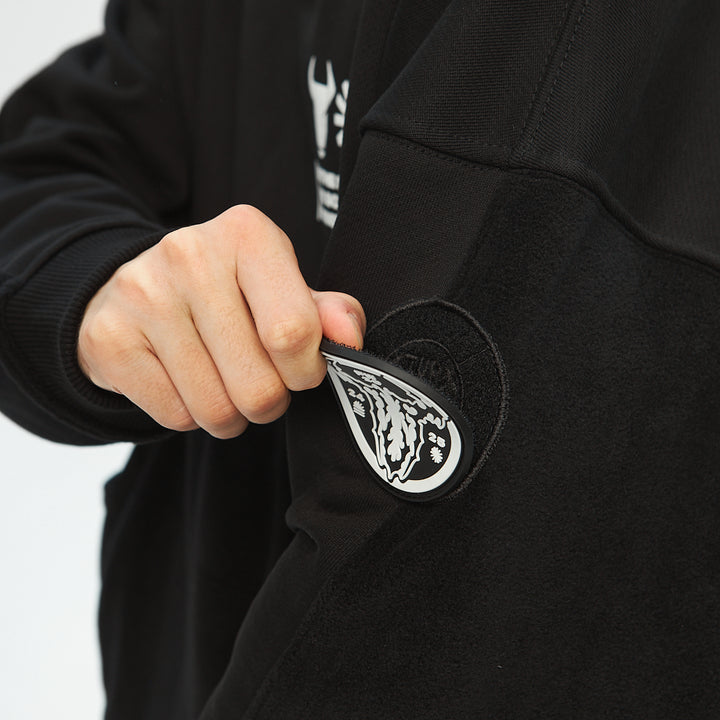 Crafted from thick fleece, this hoodie features a high zip-up collar that covers the face up to the eyes — for maximum protection and attitude. A printed chest graphic adds edge to the front, while a large embroidery on the back delivers bold expression. A velcro patch panel on the left sleeve allows for customization with interchangeable patches.