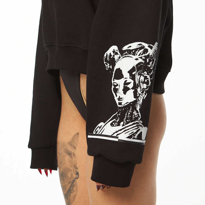 This oversized hoodie-bodysuit is a two-part hybrid design. The top is crafted from dense fleece with a zip-up high collar and hood, while the bottom section mimics a bodysuit made of biflex, fastening with snaps underneath. Three bold white prints elevate the piece with sharp graphic appeal.