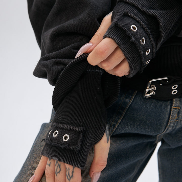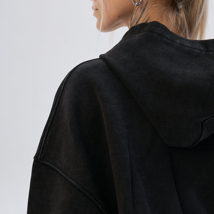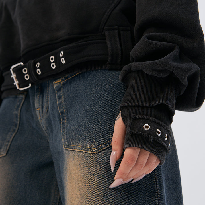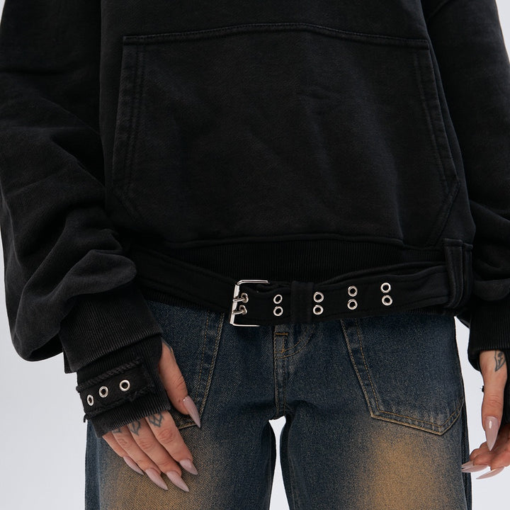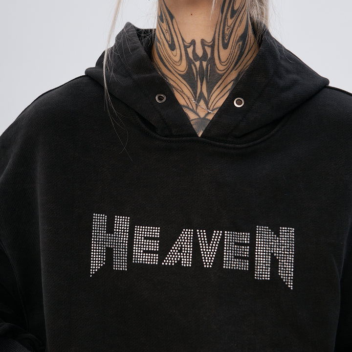 This oversized hoodie features a washed-out vintage color effect achieved through industrial garment dyeing. Double cuffs on the sleeves offer added structure and comfort. Detailed with bold elements: a belt with a metal buckle at the hem, metal eyelets throughout, and a rhinestone-embellished “HEAVEN” print that makes a statement.
