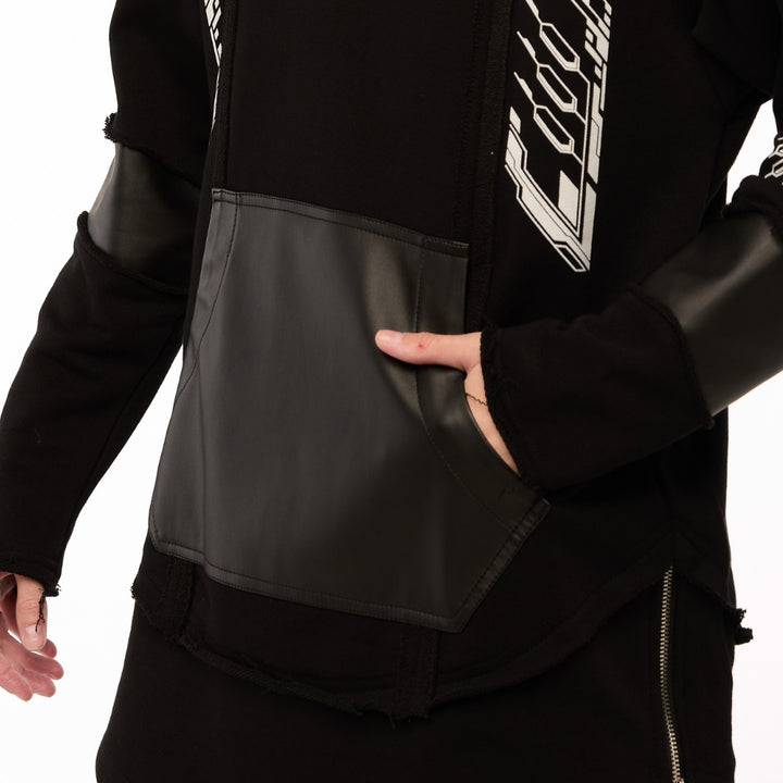 An oversized hoodie with decorative seams, raw edges, and a layered construction — for those who choose rebellion as their style. The patch pocket and artificial leather inserts on the sleeves add an edgy accent. The double-layered bottom: the upper layer has raw edges, while the lower layer is hemmed with slits, into which metal zippers are sewn. Five white prints: on the front, back, and sleeves — a visual manifesto of strength. The oversized hood has a reference to a mantle silhouette, as if preparing for transformation. Street, cyber, and the spirit of the samurai — all in one garment.