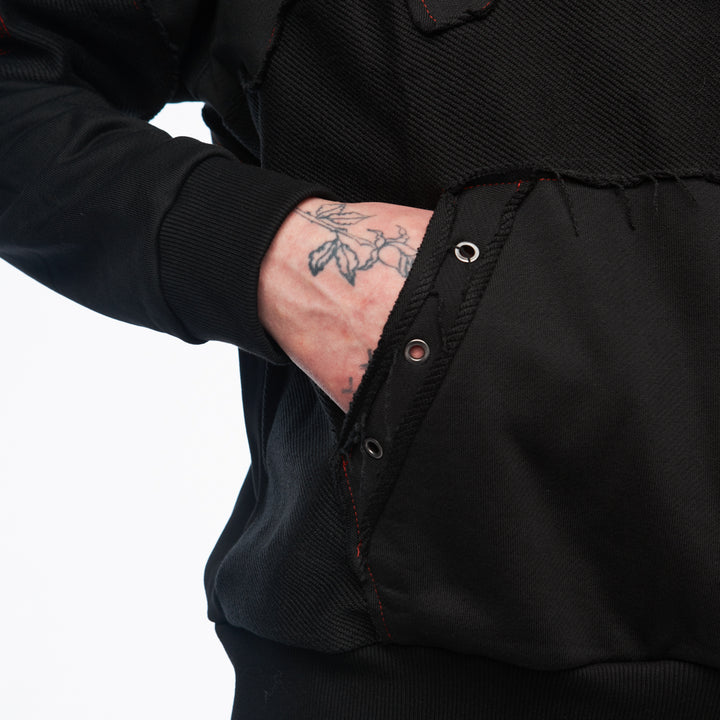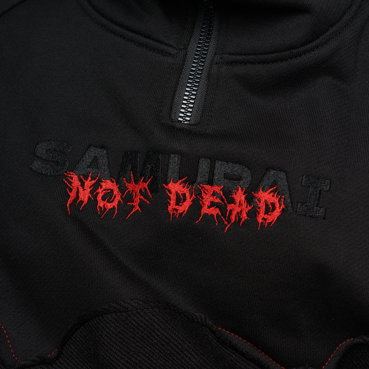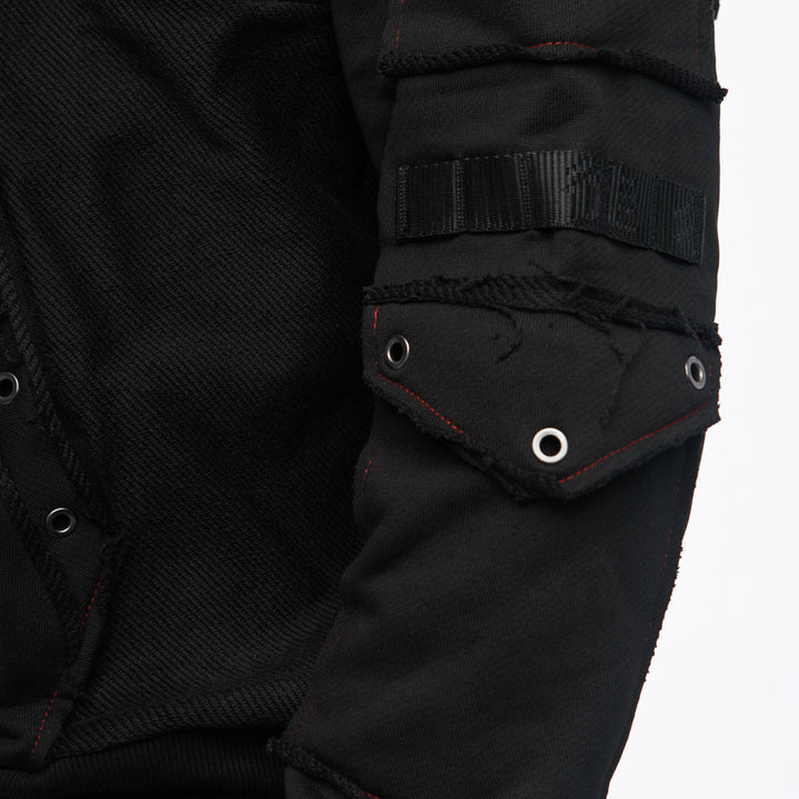 A hoodie made from dense cotton with an oversized fit — an explosion of textures, details, and a rebellious vibe. Metal eyelets, straps, raw edges, patch pockets, and red embroidery create a silhouette that speaks louder than words. The zipper runs along the neckline and transforms into the hood, turning the hoodie into a true survival mask for urban jungles. "SAMURAI NOT DEAD" is not just a slogan, but a state of mind.