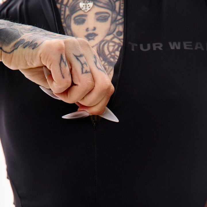 Key features of the model: A form-fitting sleeveless jumpsuit with a low stand-up collar. A functional zipper runs down the front. Mesh jersey inserts along the sides and back enhance the silhouette and improve breathability. A signature TUR print on the left front panel adds a subtle yet bold accent.