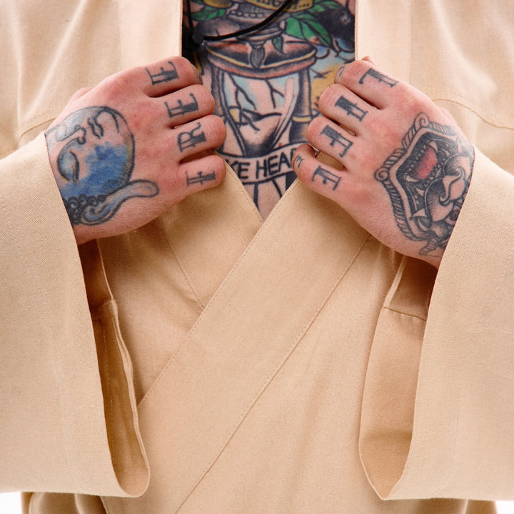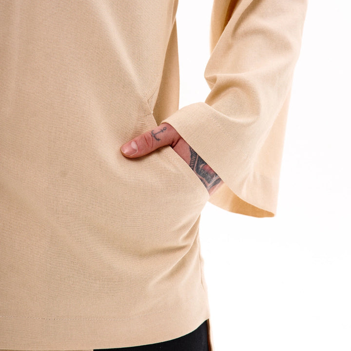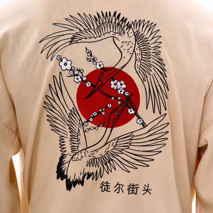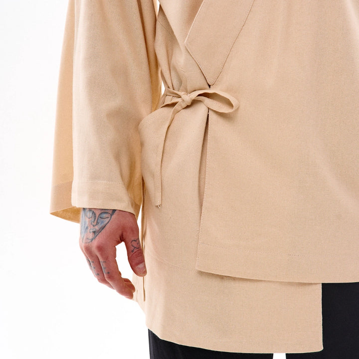 Oversized linen kimono, fastened with a wrap-around belt. Features decorative seams, two pockets, and removable sleeve straps for a visual accent. A Japanese-style embroidery is placed on the back. Available in two colors. Pairs perfectly with Murakami linen trousers or Yamaguchi pants.