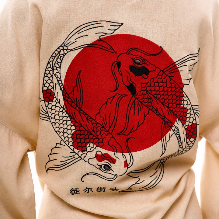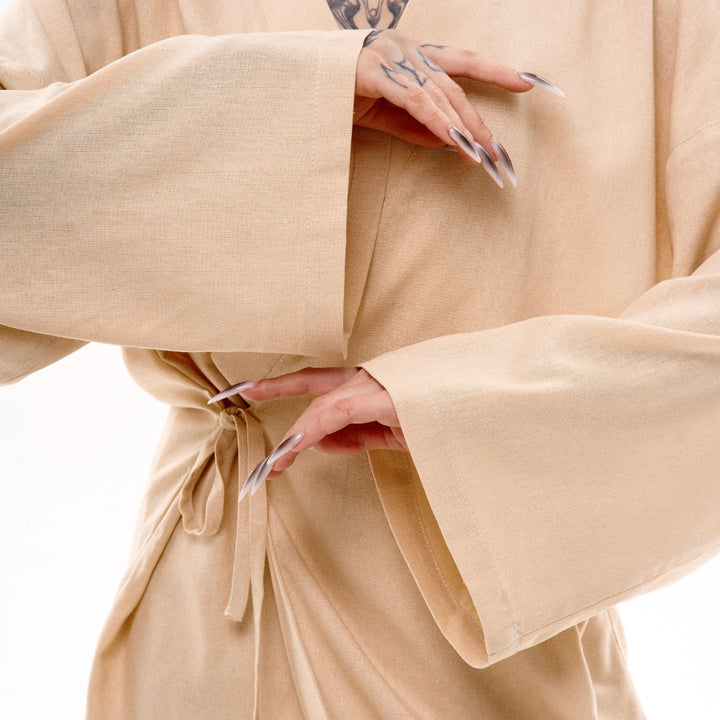 Key features of the model: Oversized kimono made of linen, tied with matching linen straps and designed to wrap around the body. Features a Japanese-style embroidery on the back and wide long sleeves. Pairs perfectly with the Kazuki trousers.