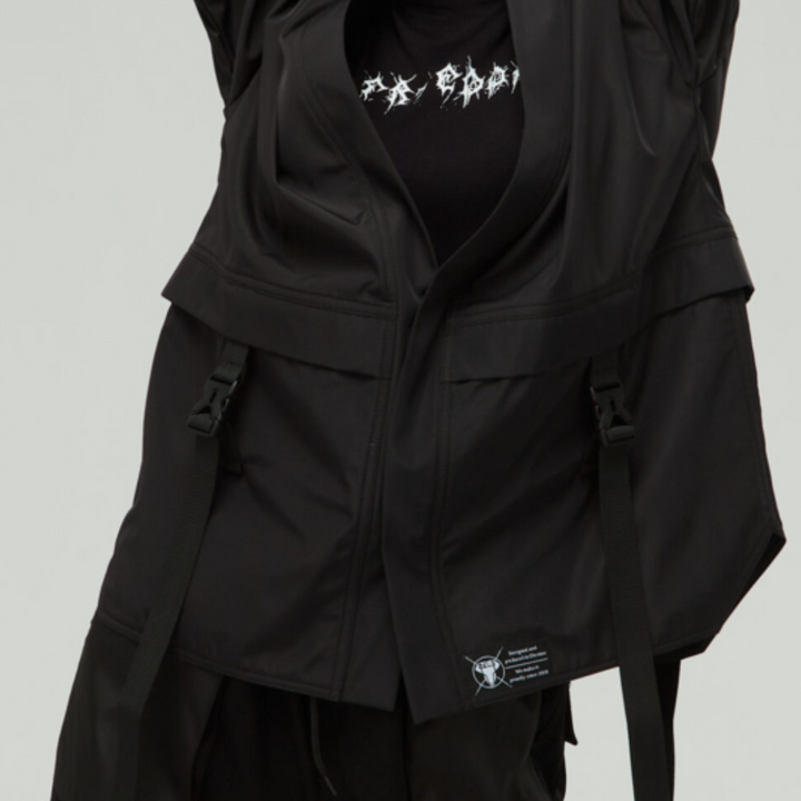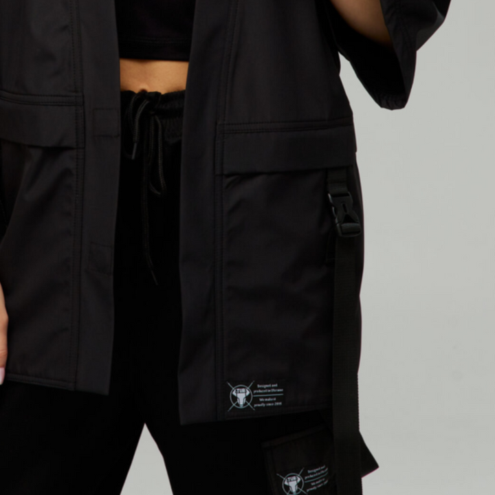 Oversized kimono with a loose fit. Two side pockets with concealed magnetic fasteners for convenience and a stylish look. Two decorative straps with buckles on the front and back add accent and complete the look.