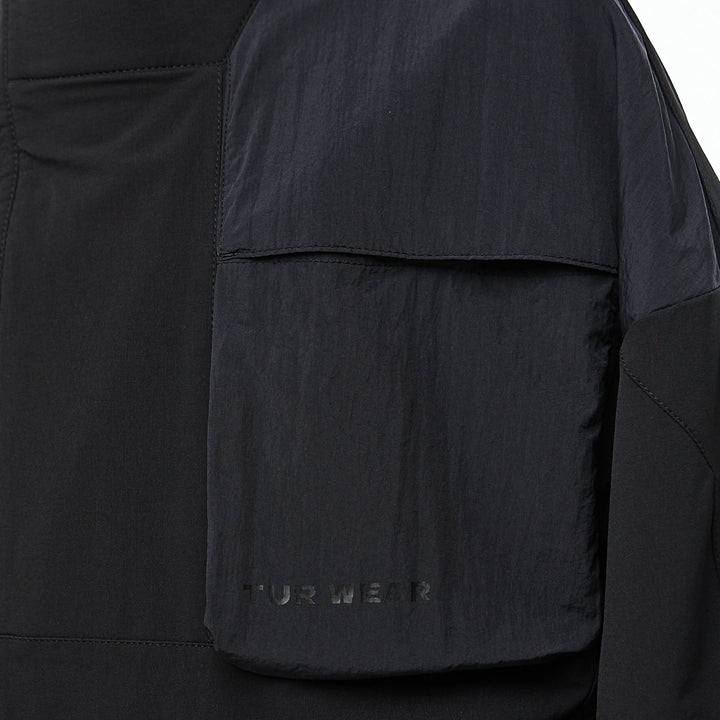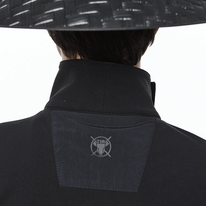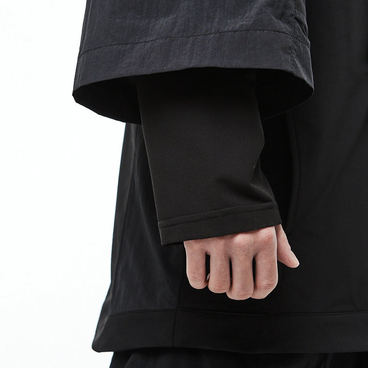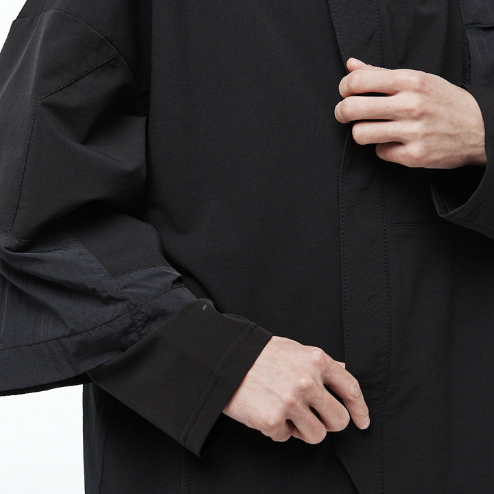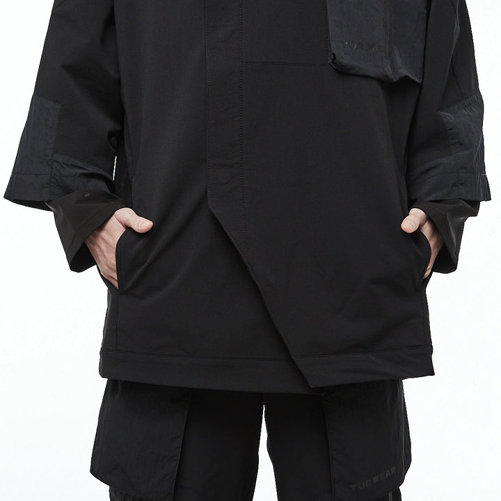 Kimono with a high stand-up collar and an asymmetrical cut. The left side features a voluminous crinkled pocket with a flap. Two additional pockets are placed in the side seams. The closure is secured with magnetic buttons for convenience. The garment also includes crinkled fabric inserts that add a textural accent. The complex cut and oversized fit create a stylish and comfortable look.
