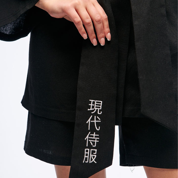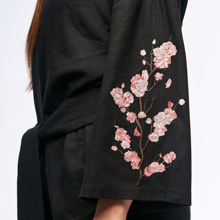 Key model features: Loose-fit kimono. Embroidered sakura design on the left sleeve. Signature black hieroglyph embroidery on the belt.