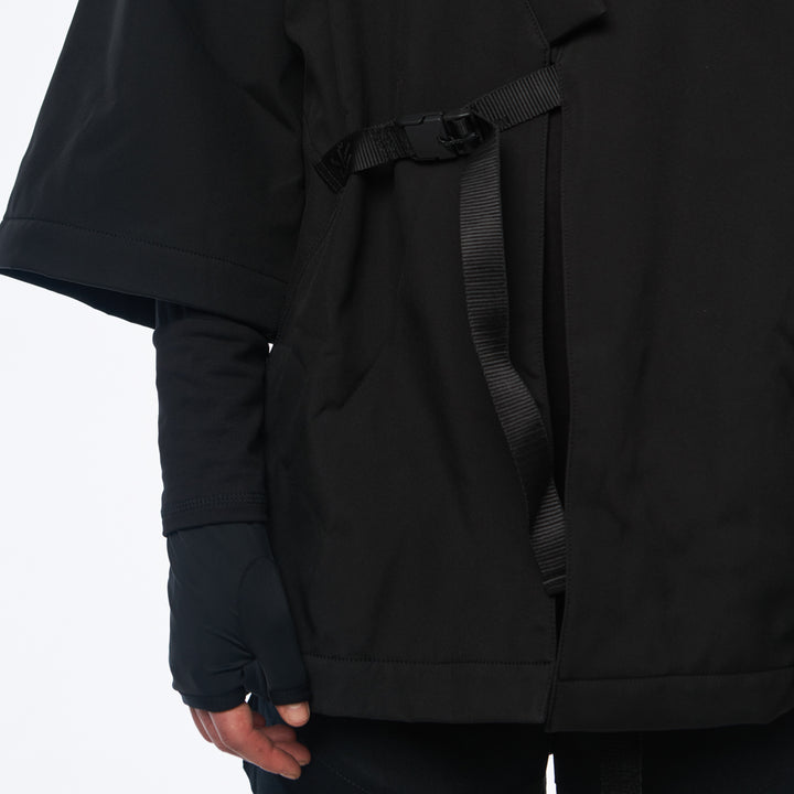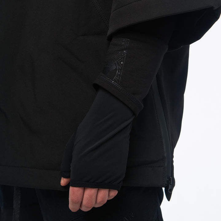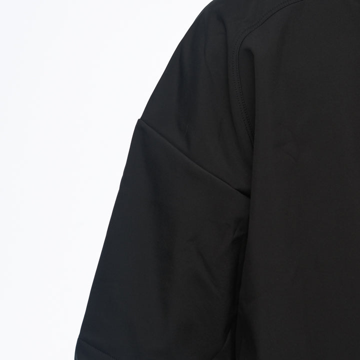 Main fabric — Softshell: a dense, wind- and water-resistant material that does not stretch and holds its shape well. Additional inserts are made from crinkle fabric — a technical material with a textured surface that adds visual dynamism and durability to the garment. The surface is smooth, feeling like a rigid protective material.