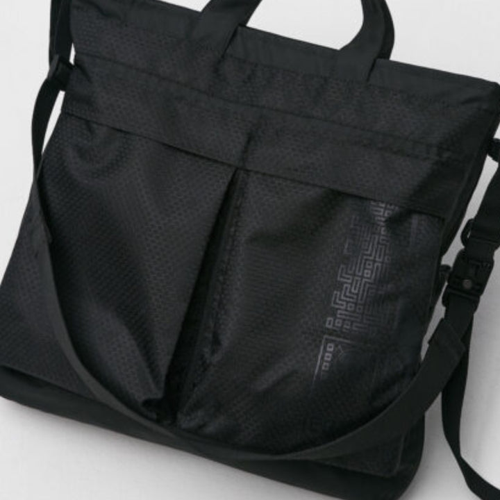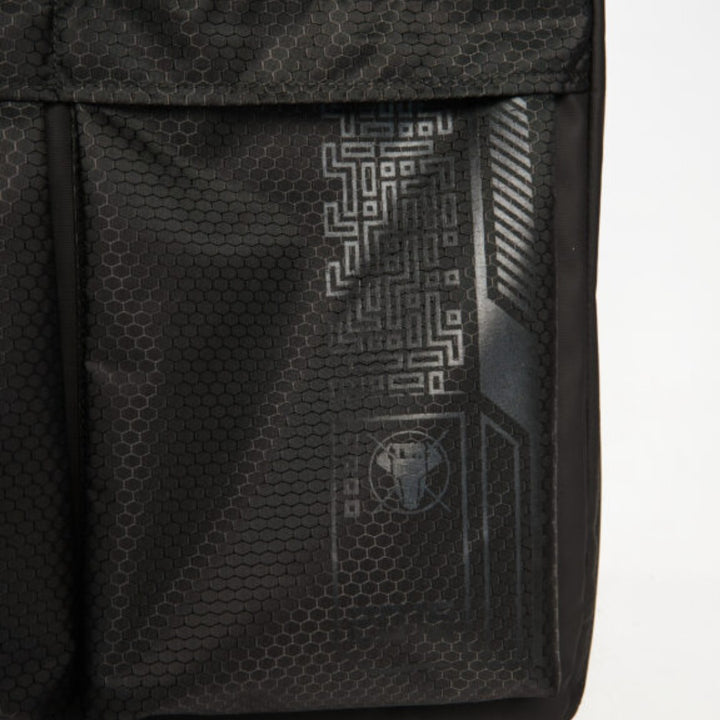A spacious bag with multiple pockets. The main compartment has a zipper closure. Inside, there is a pocket for a laptop up to 16 inches, a small items pocket, and another zip pocket. On the outside, the bag has patch pockets on both sides: three on one side and two on the other, one of which has a black print. The side walls and bottom expand in width thanks to a zipper that can be unzipped.