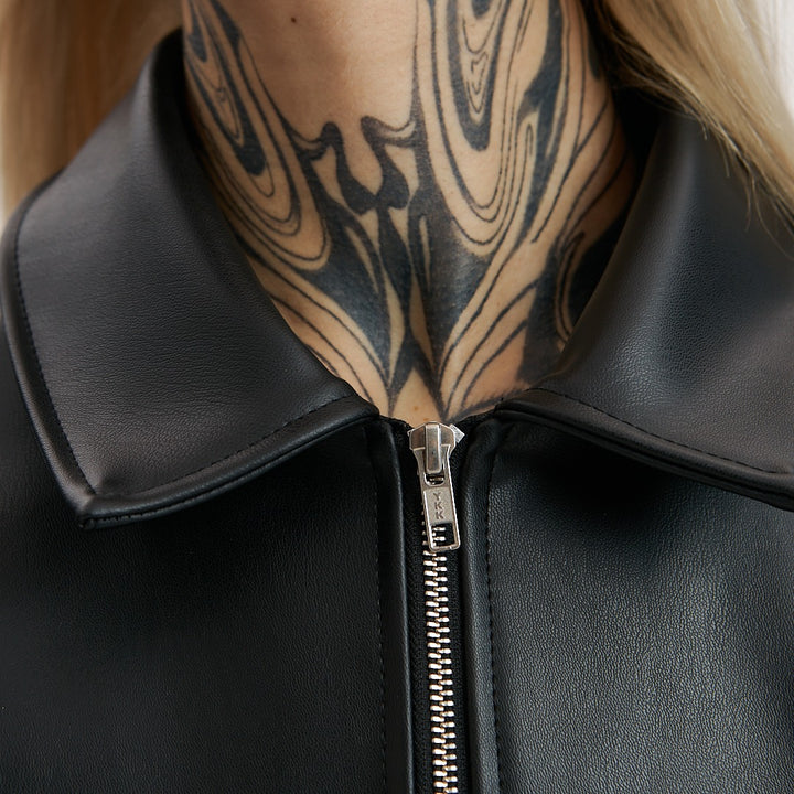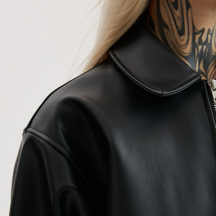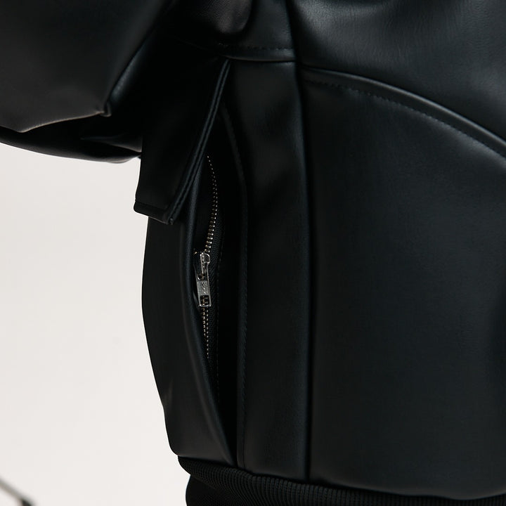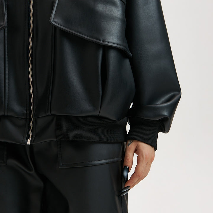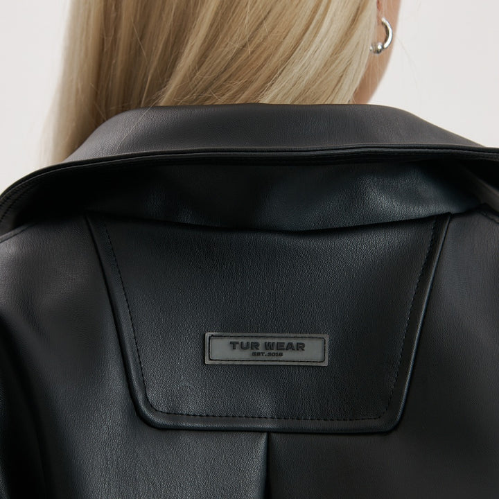 An oversized jacket of standard length, crafted from high-quality faux leather. Features two flap pockets with double-entry: one under the flap with magnetic closure and one on the side with a zipper. Includes an inner zippered pocket for added convenience. Cuffs at the hem and sleeves are made from dense polyester rib-knit. Transparent rubber "Tur Wear" logo on the back.