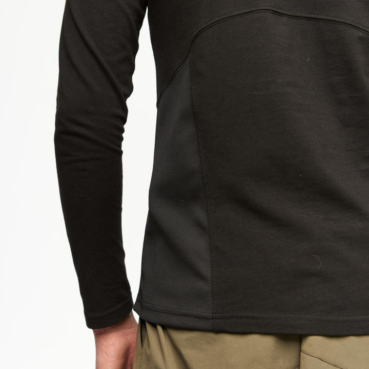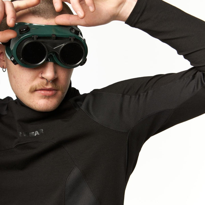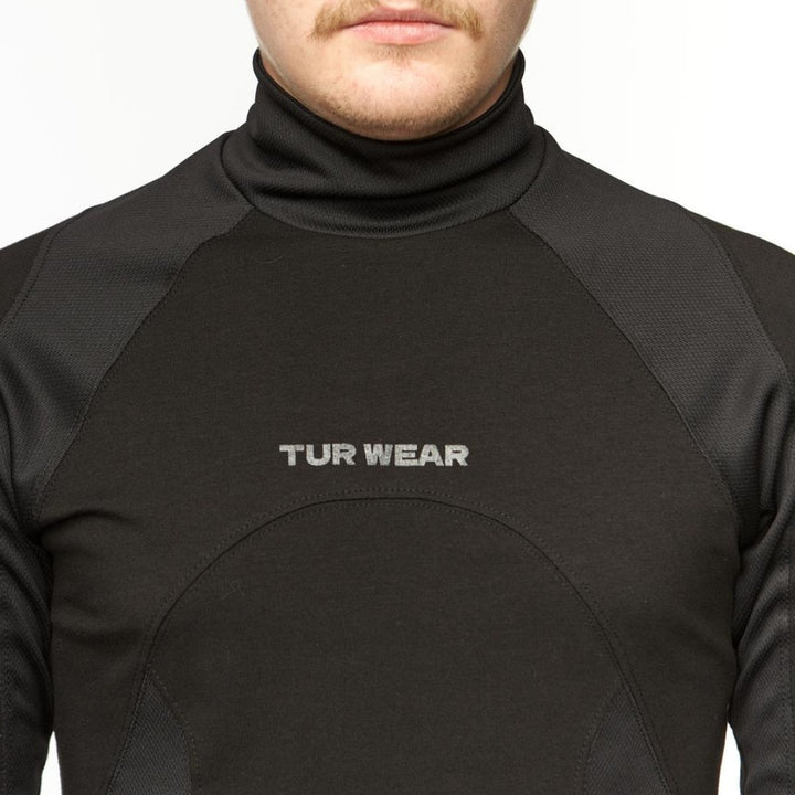 Slim-fit long sleeve with a high neck, designed for precise fit and active movement. The advanced anatomical cut emphasizes the silhouette while allowing full mobility. Coolmax panels along the sides and inner arms regulate heat and moisture during activity. A tonal black “TUR WEAR” print on the chest blends into the fabric — discreet yet expressive. Perfect as a base layer for multi-layered looks or a standalone staple for everyday wear.