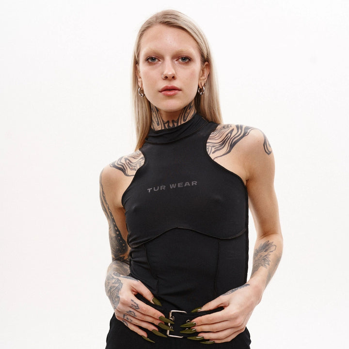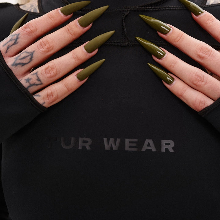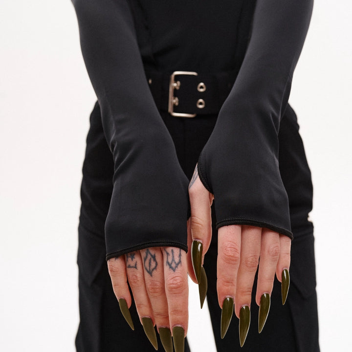 Key model features: This longsleeve consists of two parts: the sleeves are joined along the center of the front and back, and the top features a stand-up collar. All seams are exposed, with no notches. The top edge of the collar, the bottom hem, and sleeve hems are finished with overlock stitching. The sleeves are extended and include a thumbhole slit.