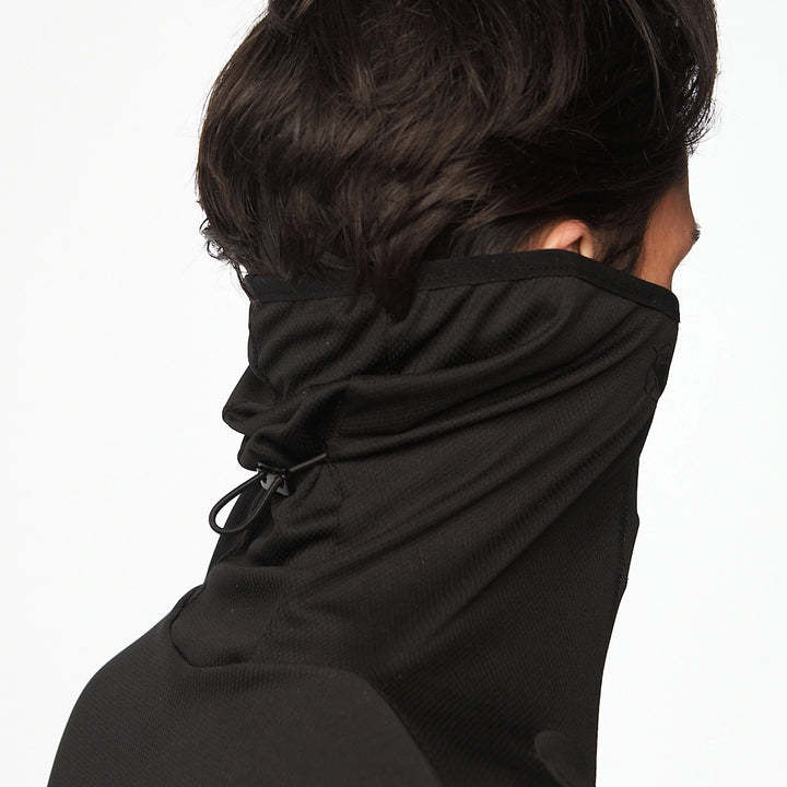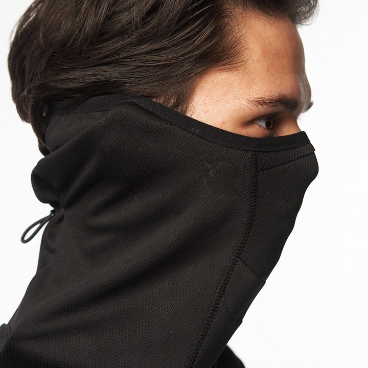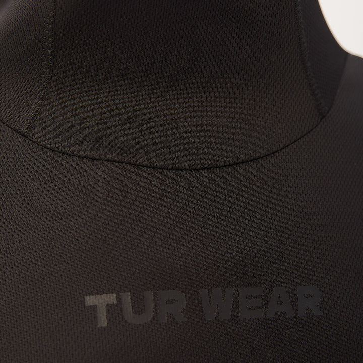 An elongated longsleeve with an anatomical balaclava-style neckline — striking a perfect balance between base layer and armor. The Coolmax fabric retains warmth while effectively wicking away moisture. Nylon panels boost durability and visual contrast. Side zip pockets maintain a clean silhouette without sacrificing function. Subtle branding includes a “TUR WEAR” chest print and logo on the mask. Bottom slits provide ease of movement. Minimalism with maximum performance.