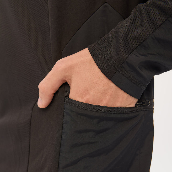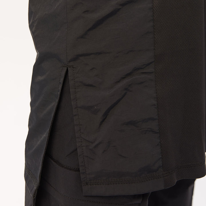 The base fabric is Coolmax piqué — breathable, quick-drying, moisture-wicking, and wrinkle-resistant. Its textured surface remains soft and lightweight. Crinkled and nylon inserts reinforce high-wear zones and give a techwear-inspired aesthetic. Equipped with durable YKK zippers.
