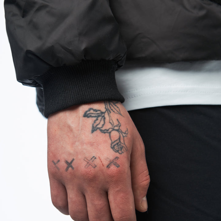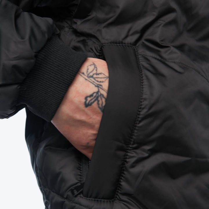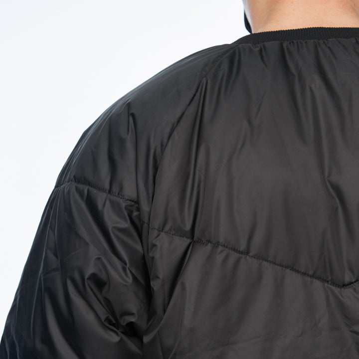 Oversized bomber jacket with raglan sleeves for a universal fit. Two external zippered pockets lined with fleece for warmth. One inner zippered pocket for secure storage. Suitable for temperatures between 0°C and +15°C.