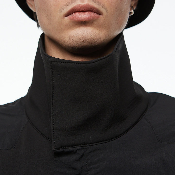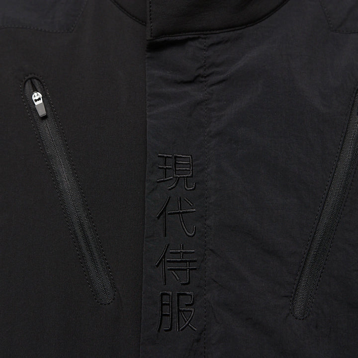 Standard-fit jacket with a high collar and a detachable feature that fastens with magnets. The sleeves are designed with a complex cut, featuring crinkled fabric inserts and cuffs with fabric patches fastened with Velcro. Two chest pockets and one inner zippered pocket. A signature logo on the back and embroidered brand characters on the detachable part. The detachable feature is made from crinkled fabric (top layer). Two side seam pockets. All internal seams are bound. The jacket has a total of 5 pockets. The gray jacket is finished using industrial washing technology, giving it a unique color and texture.