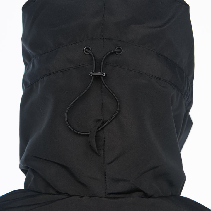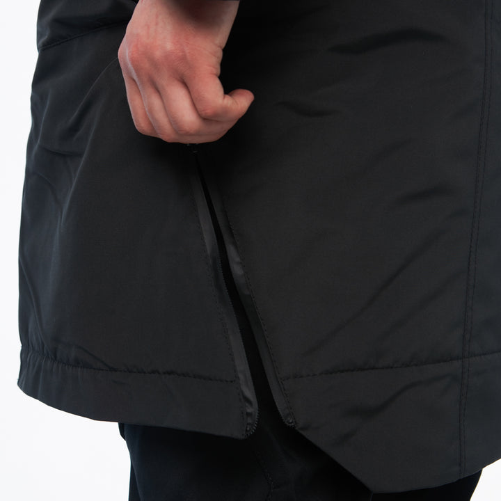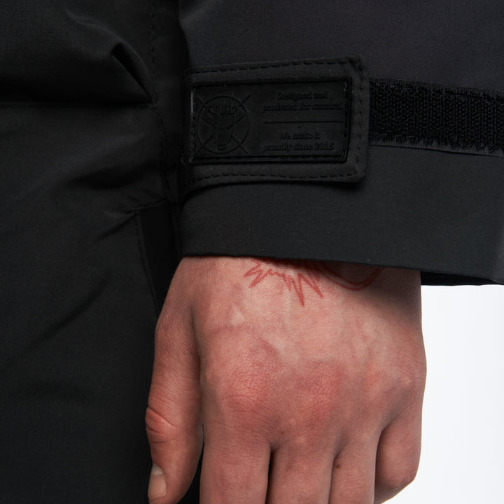 A spring parka with an extended cut, featuring zippers on the sides, a deep hood with adjustable straps, two patch pockets, a pocket for headphones, a MOLLE system, an inner zippered pocket, and adjustable patches on the sleeves. The parka also includes a zipper with two sliders for added convenience.