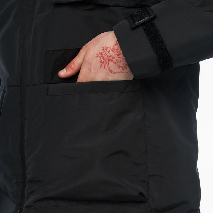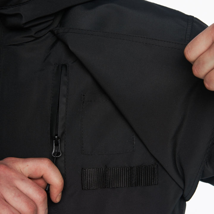 Main fabric — Polycotton, combining durability with breathability. The interior of the body area is insulated with microfleece — a soft, lightweight material that retains heat. The filler is Slimtex 150, a modern insulation material that provides reliable thermal insulation without adding extra bulk. The outer fabric feels dense and smooth, while the inner insulation is soft and non-bulky. The garment is equipped with YKK zippers — reliable hardware resistant to heavy use.