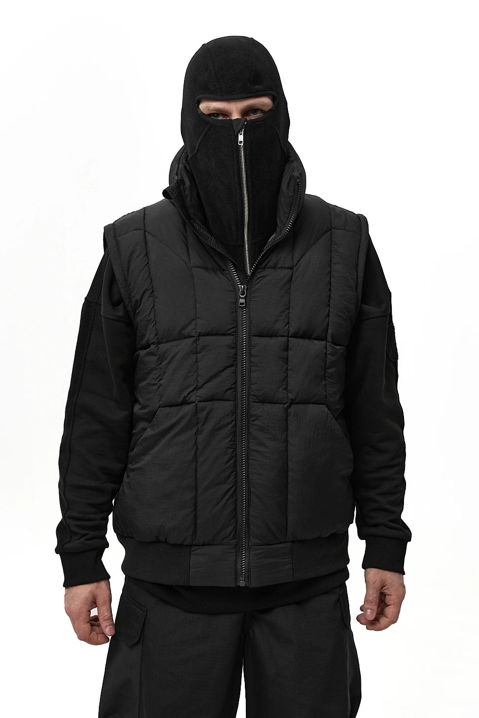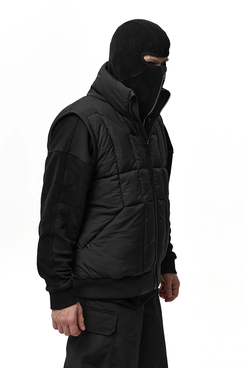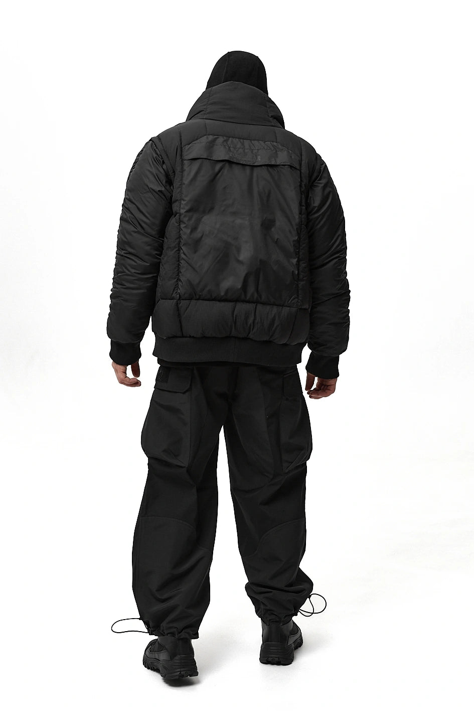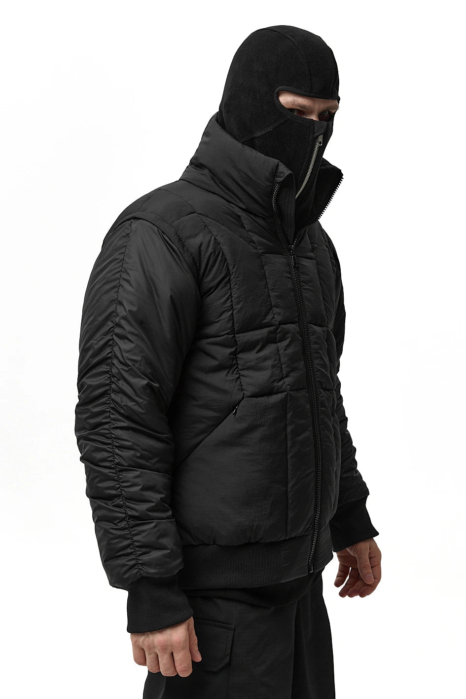 Mid-length transformer jacket with a high collar. The main part (vest) is made of Crash fabric with a crumpled effect, giving the model a unique character. The sleeves can be detached with hidden zippers, allowing the jacket to be easily transformed into a vest. On the back of the jacket, there is a large decorative pocket into which the jacket can be folded for convenient storage or transport. Temperature range: down to 0°C — an ideal choice for autumn and early winter.