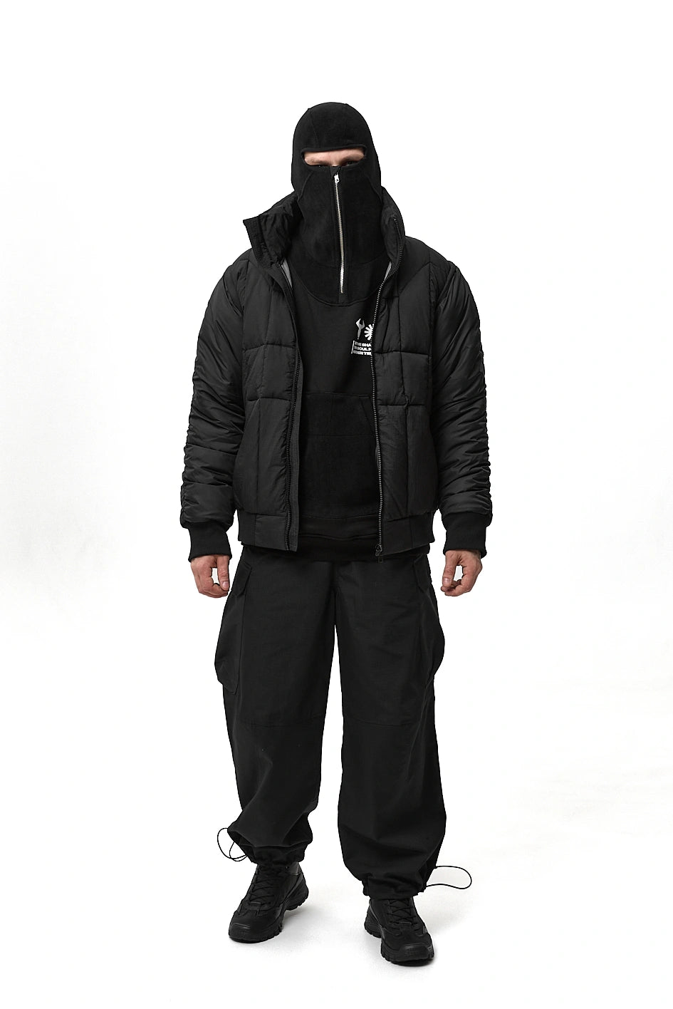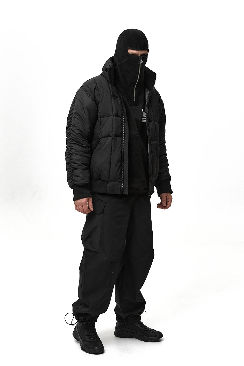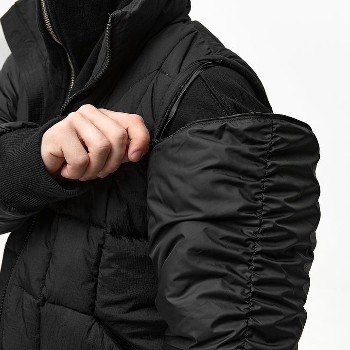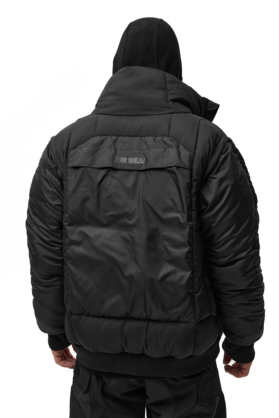 Mid-length transformer jacket with a high collar. The main part (vest) is made of Crash fabric with a crumpled effect, giving the model a unique character. The sleeves can be detached with hidden zippers, allowing the jacket to be easily transformed into a vest. On the back of the jacket, there is a large decorative pocket into which the jacket can be folded for convenient storage or transport. Temperature range: down to 0°C — an ideal choice for autumn and early winter.