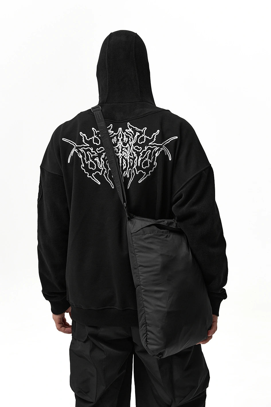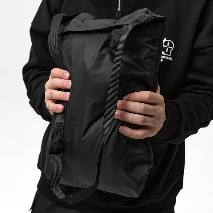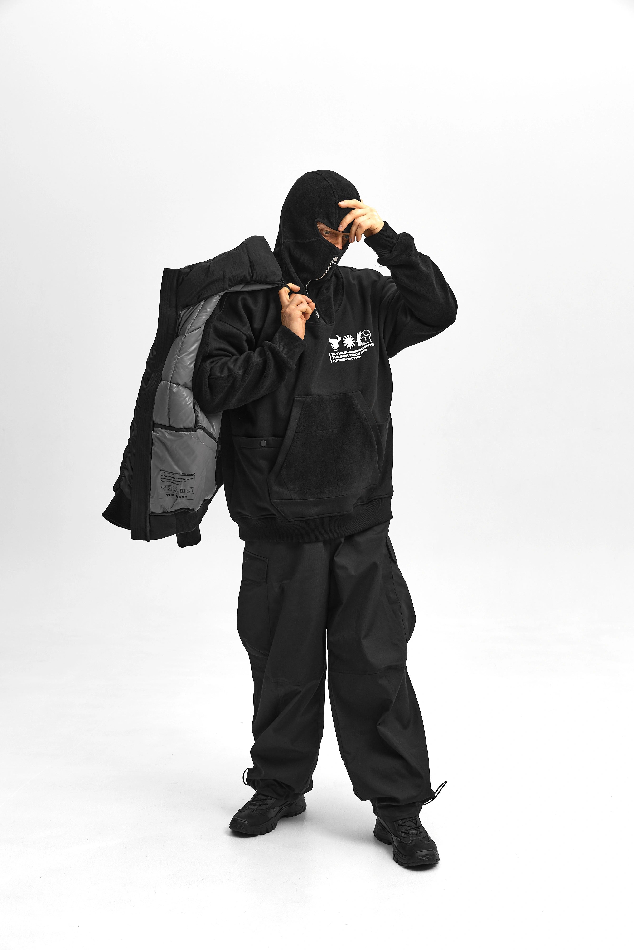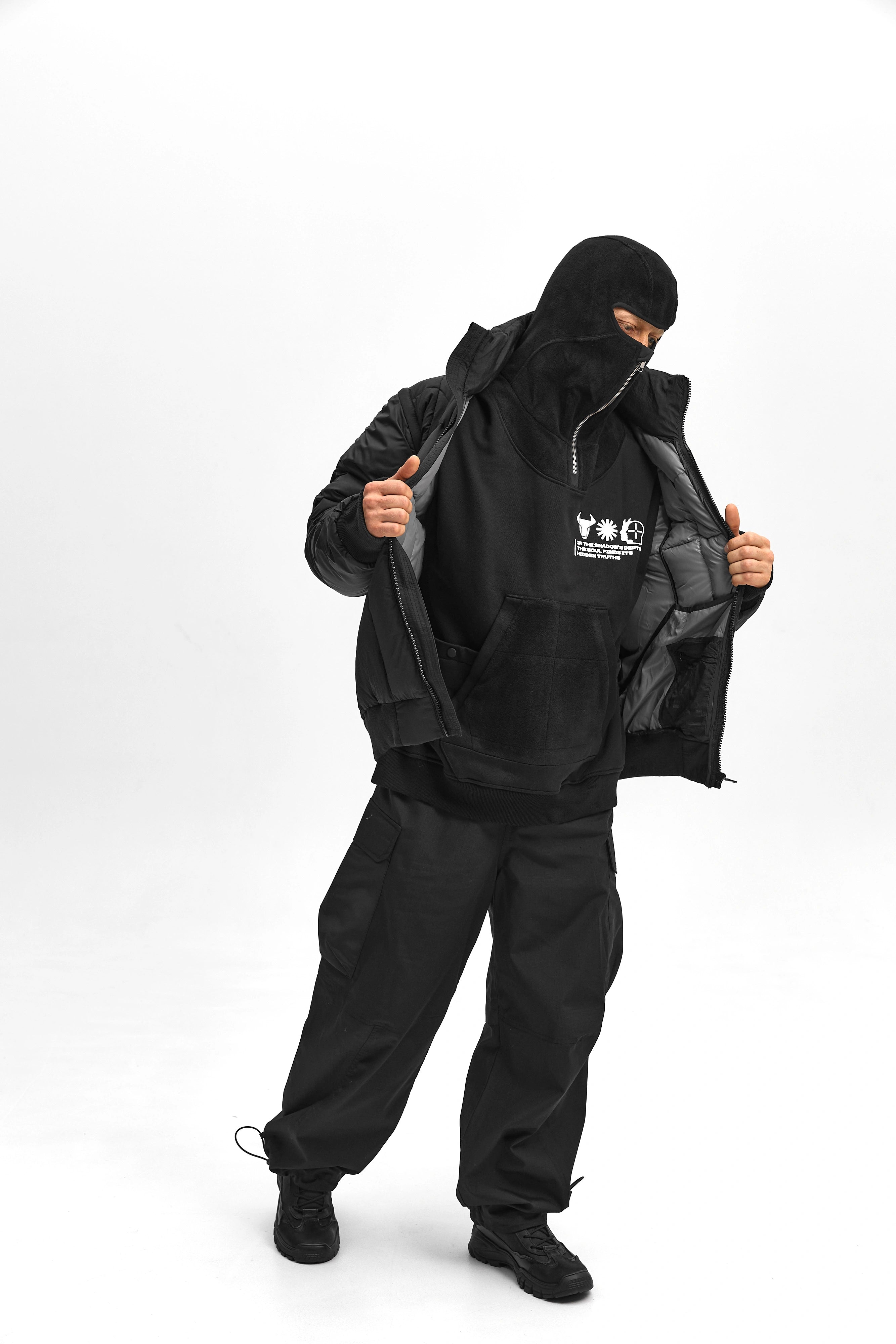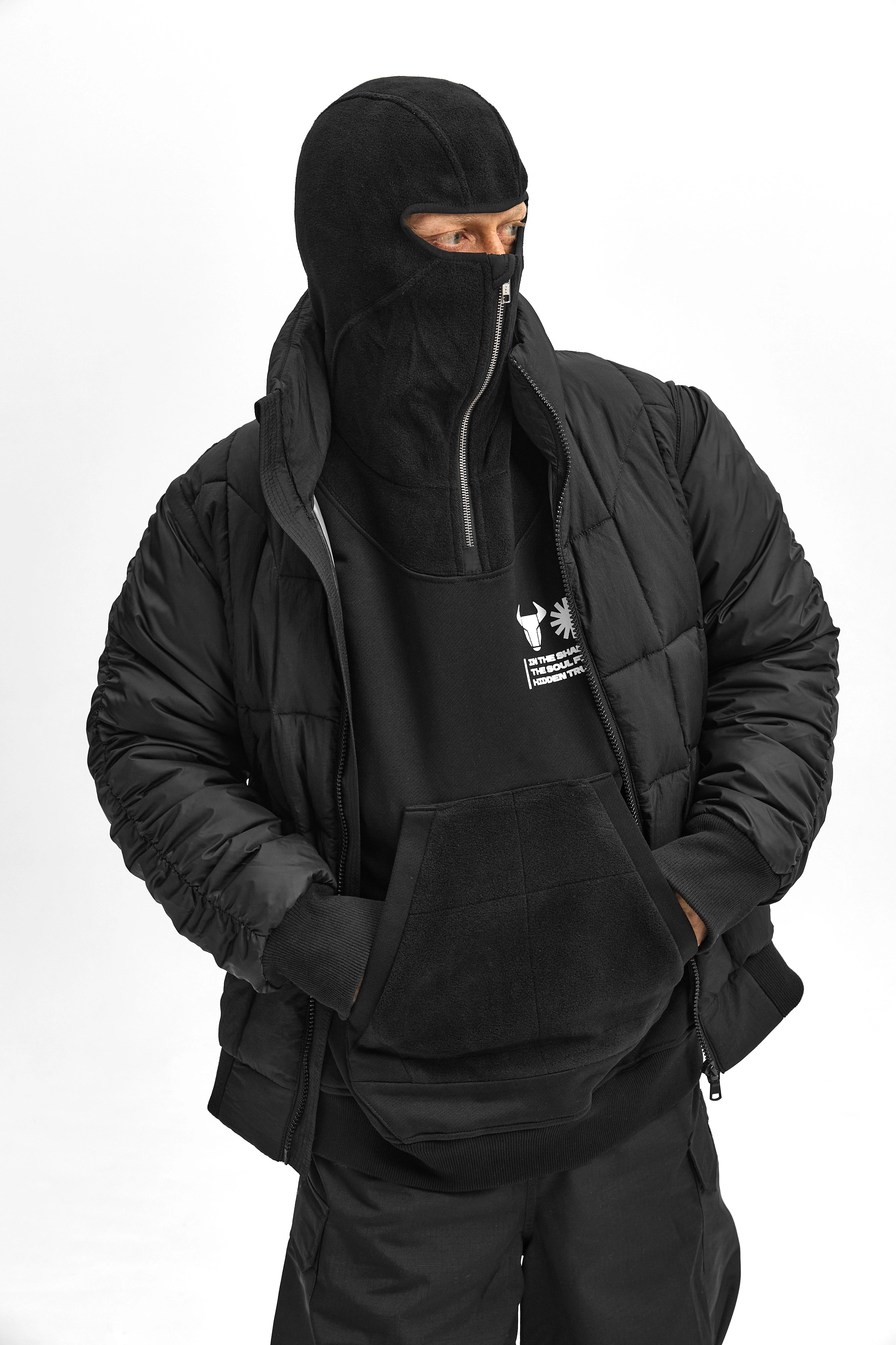 Mid-length transformer jacket with a high collar. The main part (vest) is made of Crash fabric with a crumpled effect, giving the model a unique character. The sleeves can be detached with hidden zippers, allowing the jacket to be easily transformed into a vest. On the back of the jacket, there is a large decorative pocket into which the jacket can be folded for convenient storage or transport. Temperature range: down to 0°C — an ideal choice for autumn and early winter.