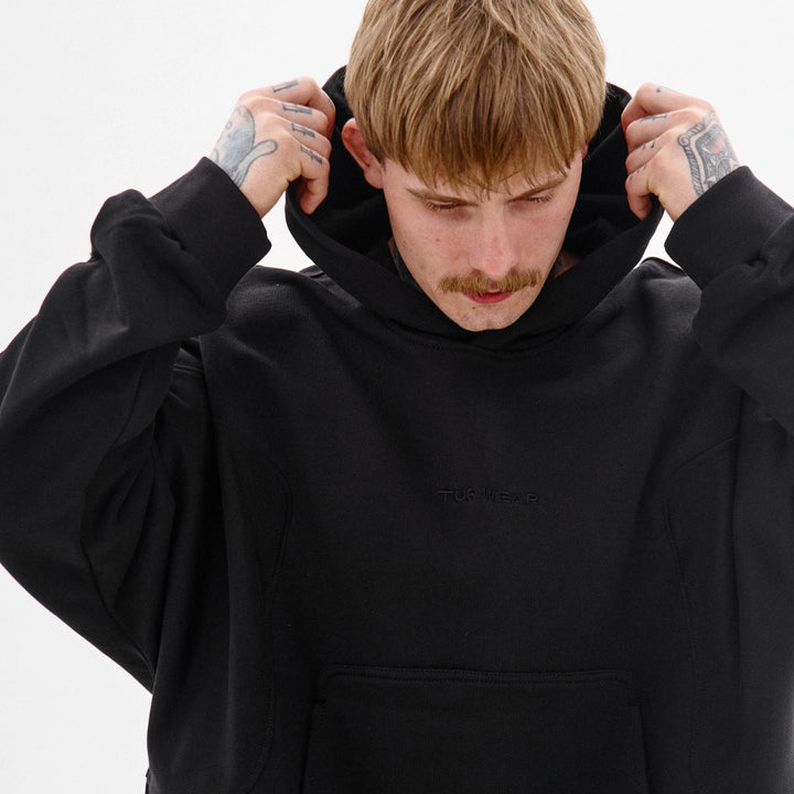Key features of the model: Oversized hoodie, based on the "Invisible" fit but with significantly larger dimensions. Sleeves are finished with ribbed cuffs. The bottom hem is adjustable with a drawstring and cord locks.