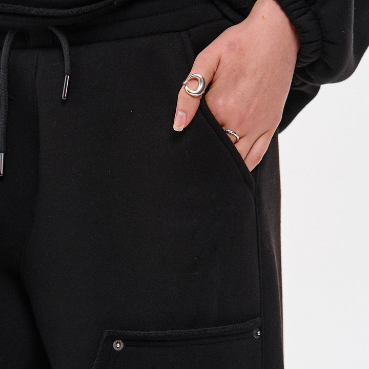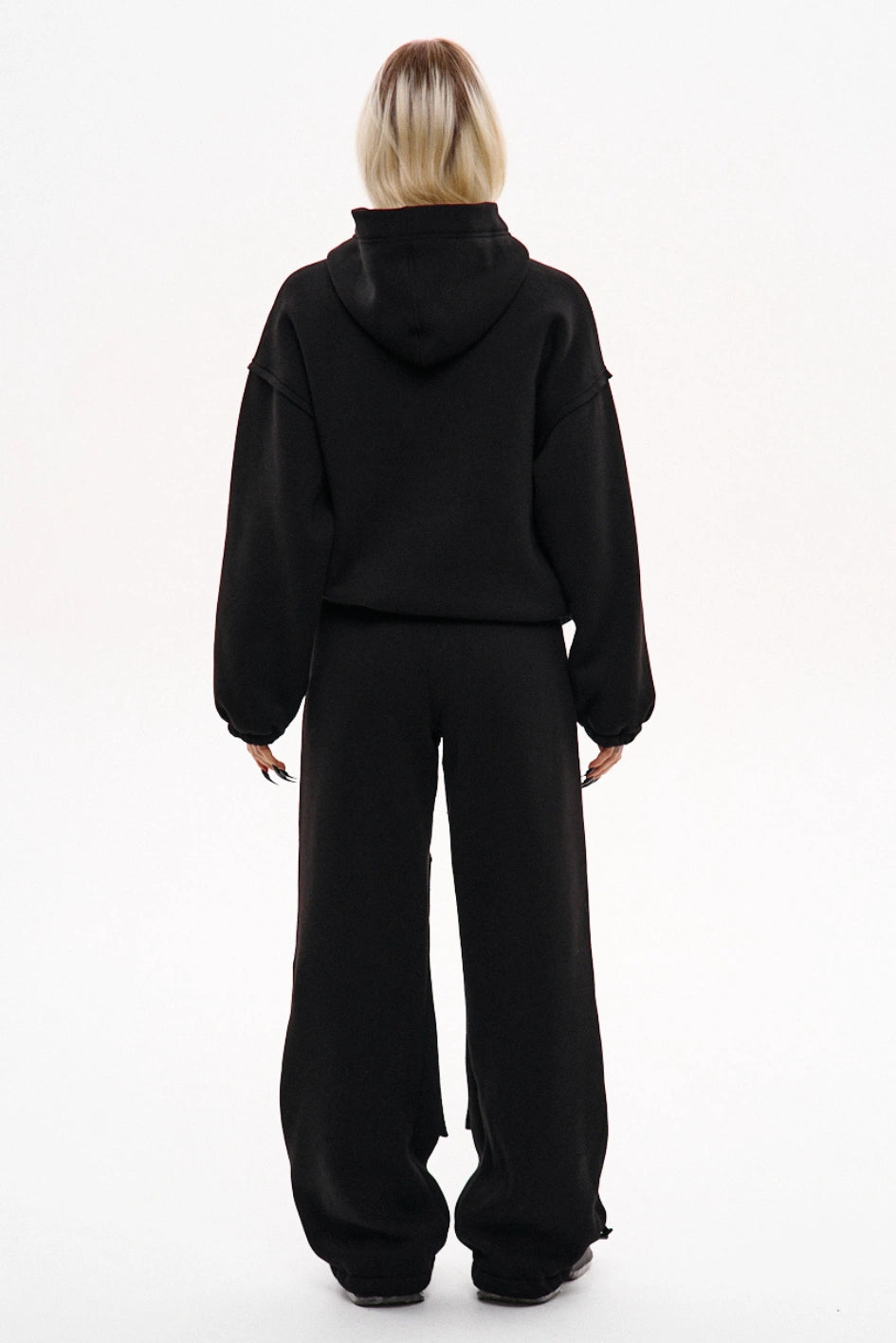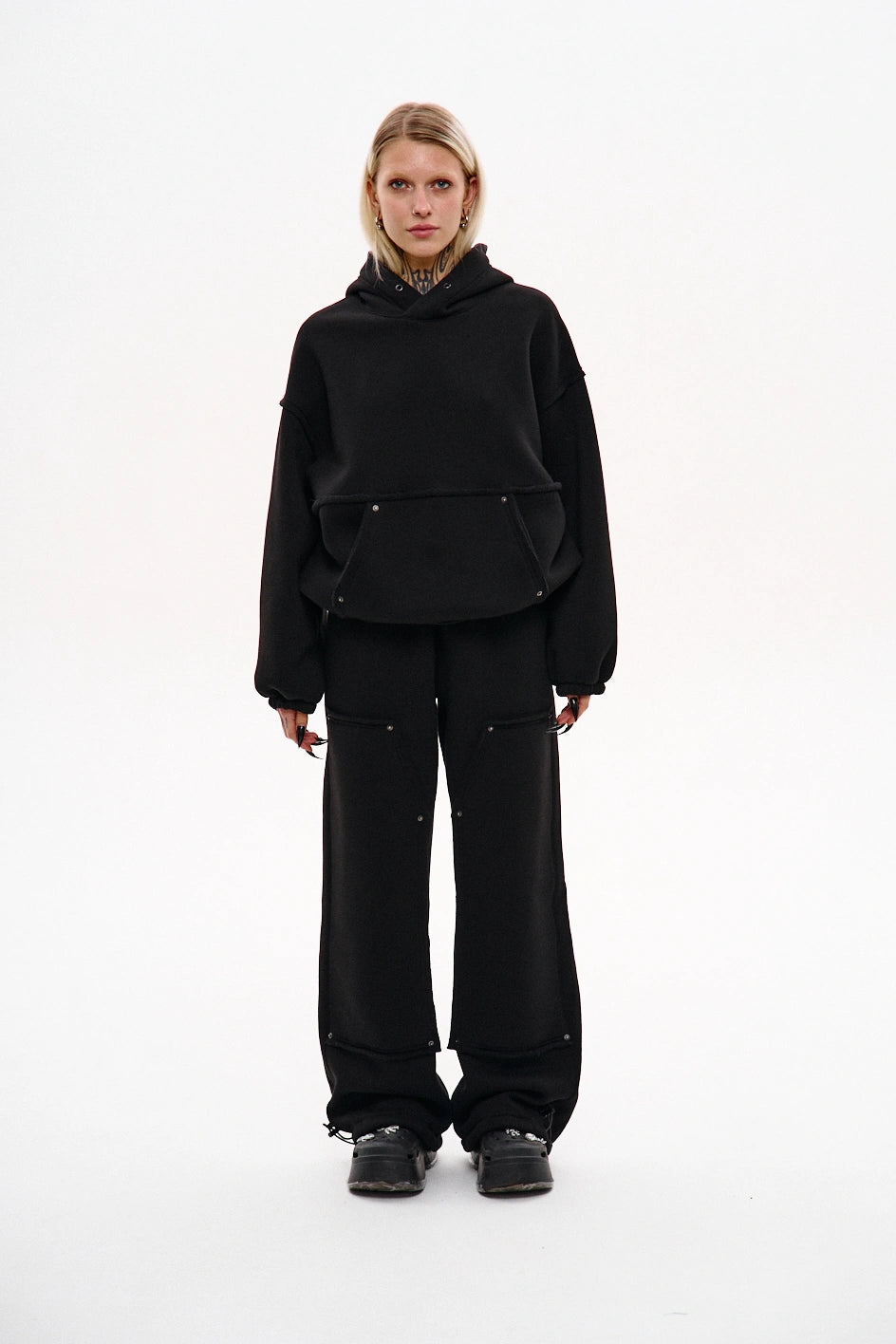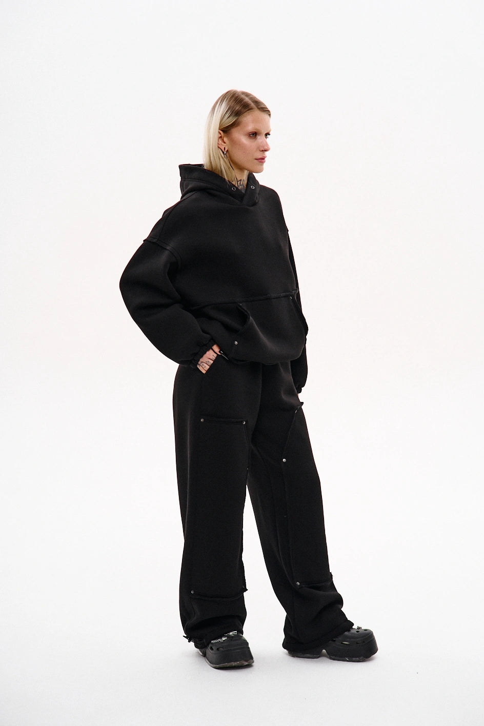 Oversized tracksuit made of three-thread fleece knit — soft, warm, and comfortable, designed for colder days. The pants feature a wide fit with raised inserts and raw seams that add character to the look. The cuffs have adjustable drawstrings to modify the width. The oversized hoodie features an elastic drawstring with stoppers at the hem for adjustable fit. Both pieces of the set include metal snap fasteners as decorative accents, highlighting the technical character of the model.