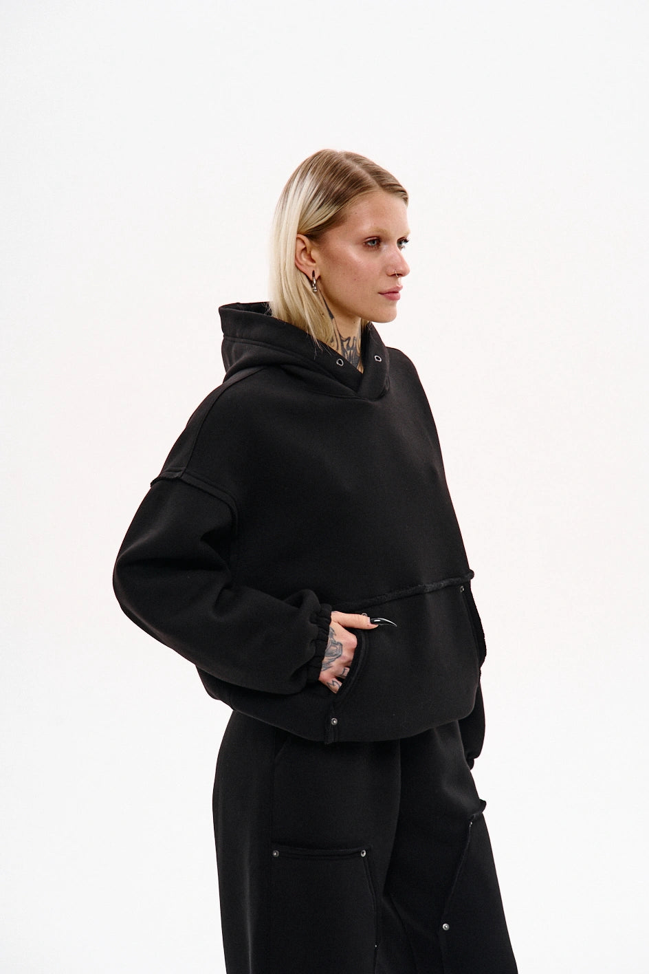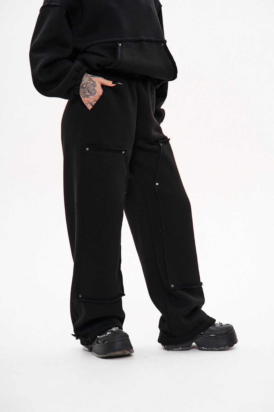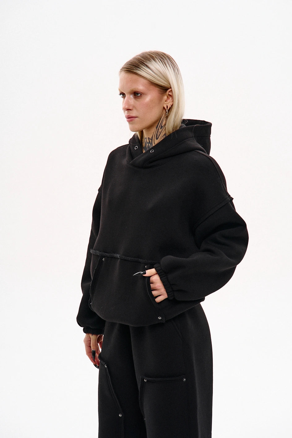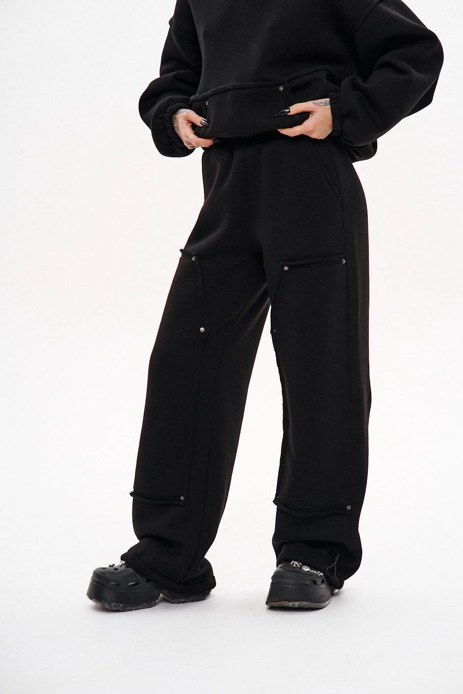 Oversized tracksuit made of three-thread fleece knit — soft, warm, and comfortable, designed for colder days. The pants feature a wide fit with raised inserts and raw seams that add character to the look. The cuffs have adjustable drawstrings to modify the width. The oversized hoodie features an elastic drawstring with stoppers at the hem for adjustable fit. Both pieces of the set include metal snap fasteners as decorative accents, highlighting the technical character of the model.