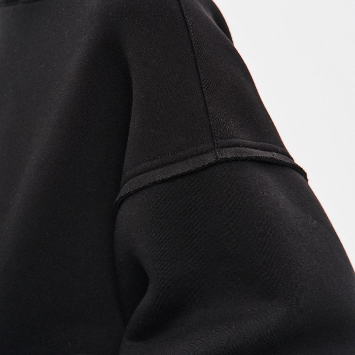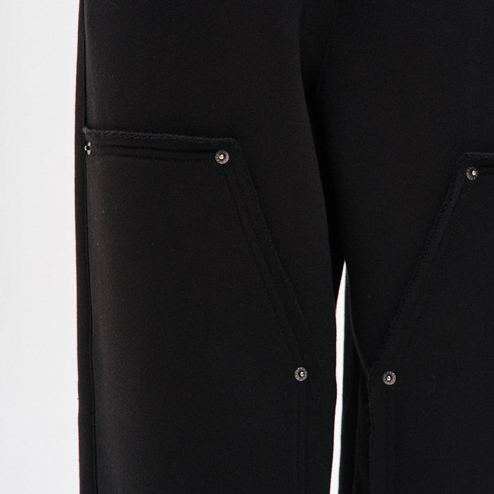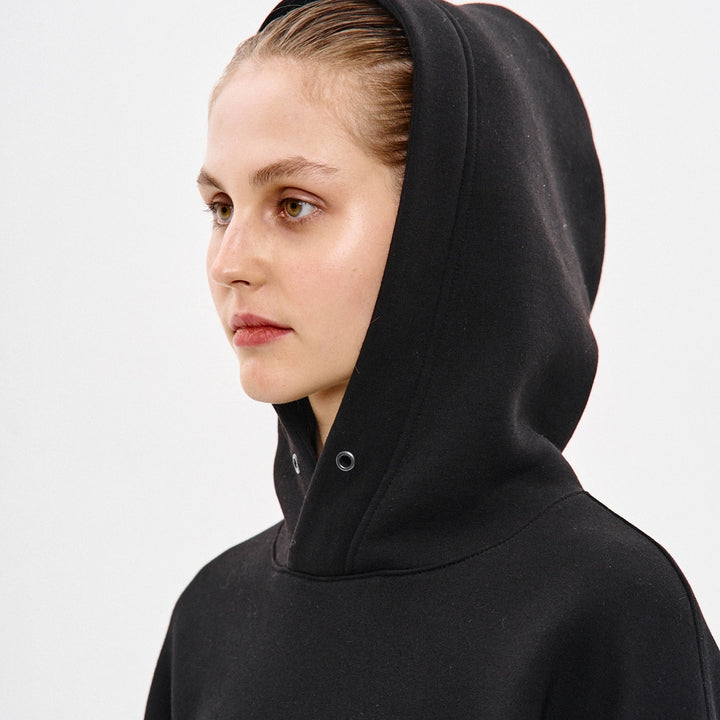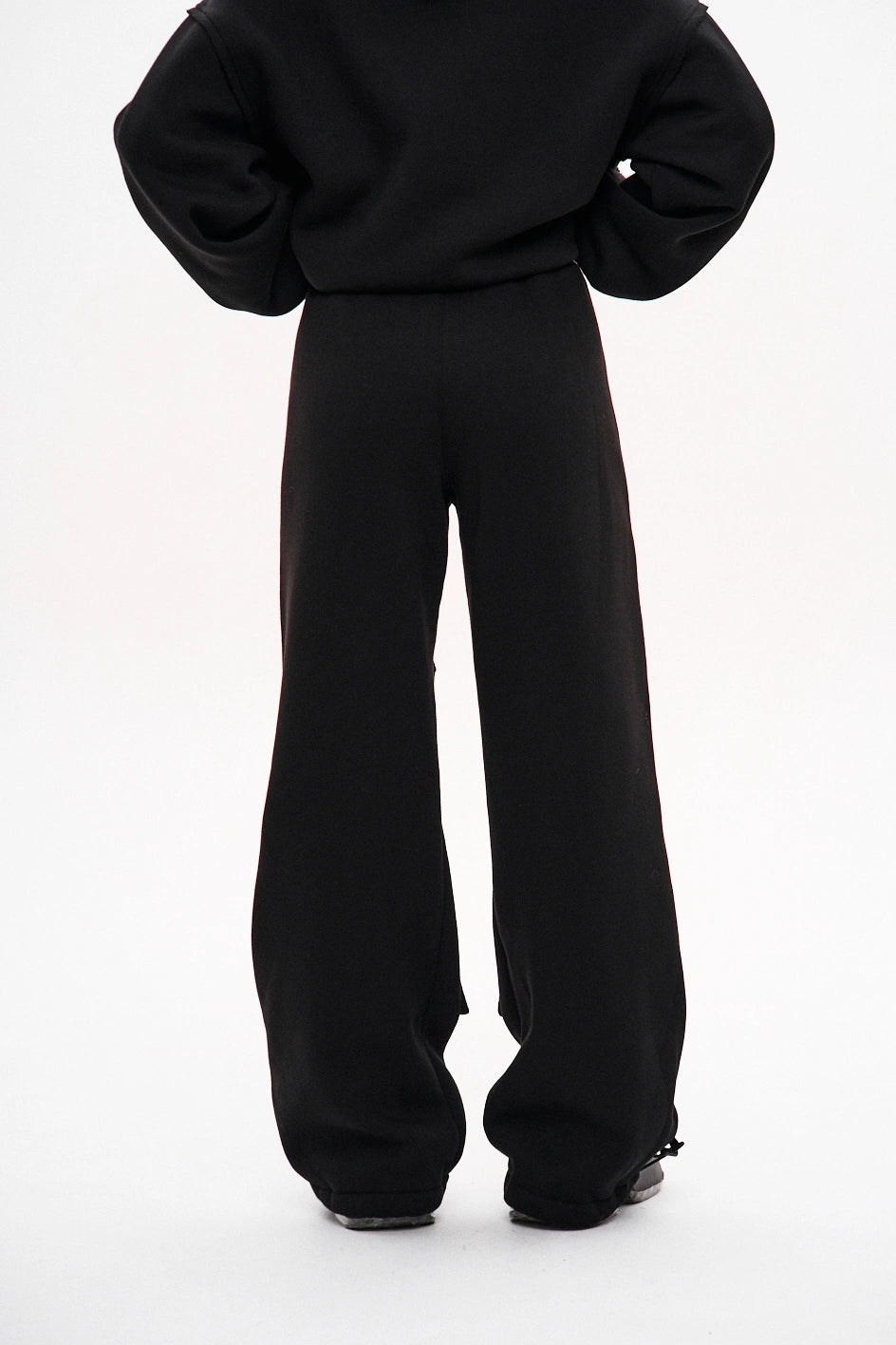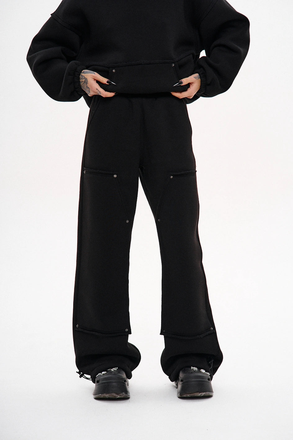 Oversized tracksuit made of three-thread fleece knit — soft, warm, and comfortable, designed for colder days. The pants feature a wide fit with raised inserts and raw seams that add character to the look. The cuffs have adjustable drawstrings to modify the width. The oversized hoodie features an elastic drawstring with stoppers at the hem for adjustable fit. Both pieces of the set include metal snap fasteners as decorative accents, highlighting the technical character of the model.