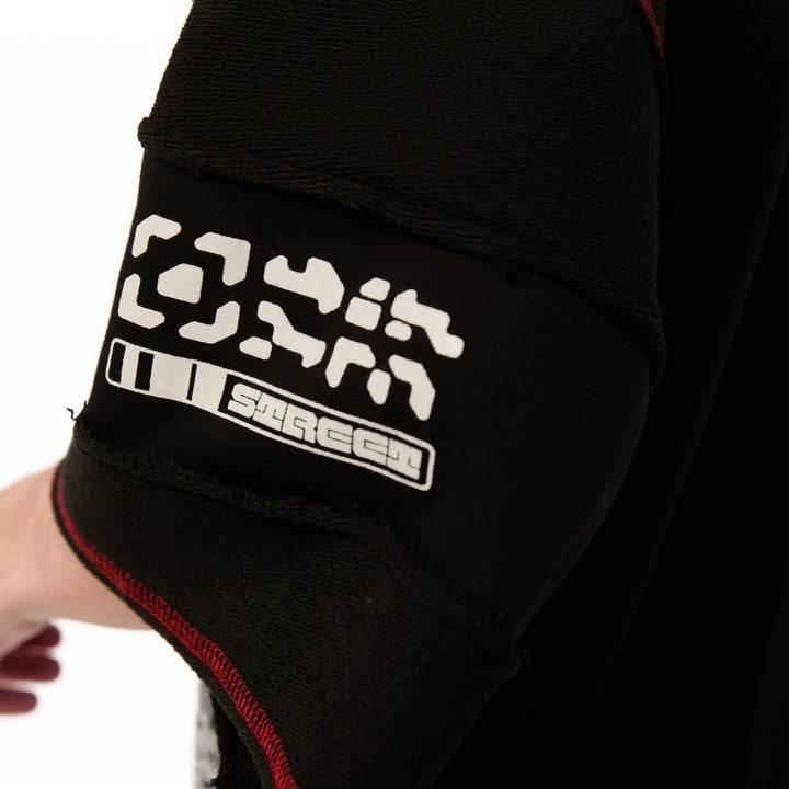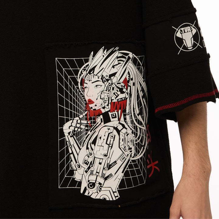 An oversized T-shirt made from unique French Terry with loops that extend to the front of the garment, creating an interesting textured effect. Due to the complex cut, parts of the T-shirt, such as the front and left sleeve, feature stylish loop inserts on the inside. Three prints placed on different parts of the T-shirt add originality and expression. The perfect choice for those who want to stand out and combine comfort with modern design.